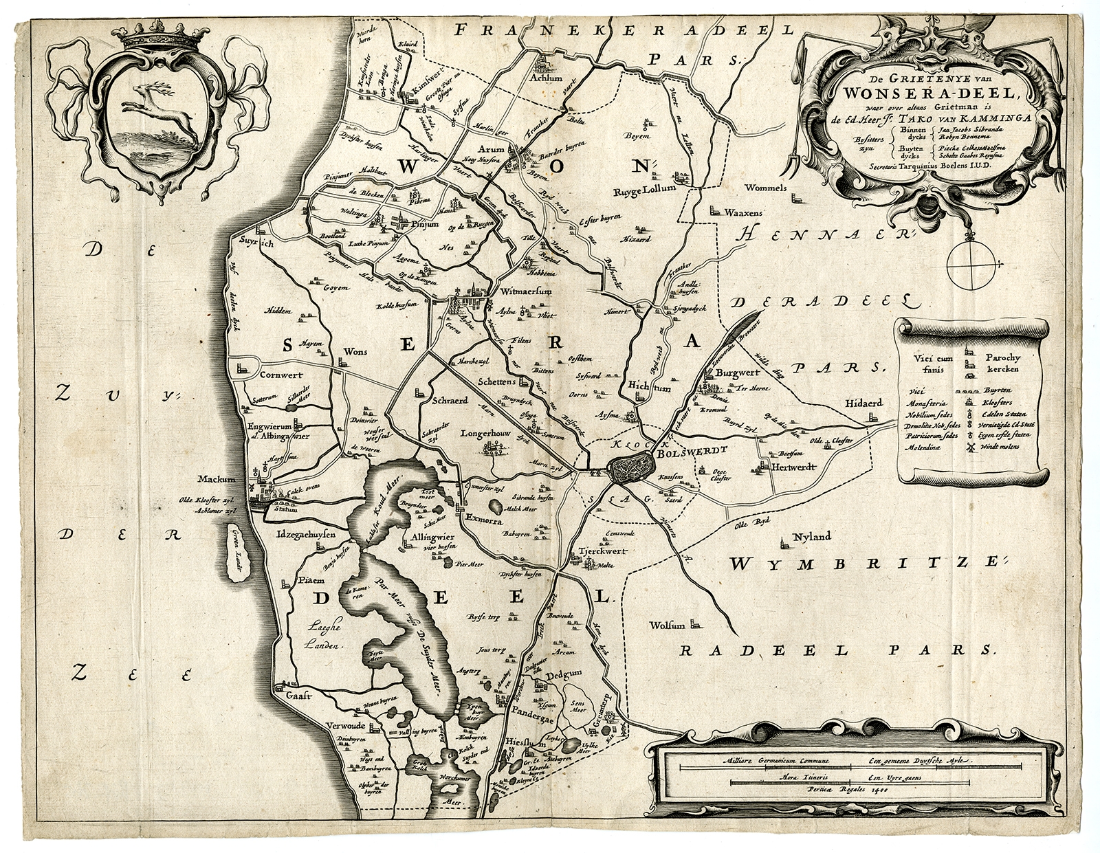 Antique Map of the region of Wonseradeel by Schotanus (1664) $ 161.82 instead of Availability: in stock Condition : Fair, given age. Edges with some small tears; backed. No top margin. Several vertical creases. Original folds, as issued. General age-related toning and/or occasional minor defects from handling. Please study image carefully. Date : 1664 Overall size : 37.2 x 29 cm. Image size : 36.2 x 28.3 cm. Description: Antique map titled 'De Grietenije van Wonsera-deel (..).' Map of the Grietenij of Wonseradeel, Friesland, The Netherlands. Multiple cartouches, key and coat of arms. "Beschrijvinge ende nieuwe caerten van de Heerlyckheydt van Frieslandt (…).", by Schotanus a Sterringa, first published in 1664. |