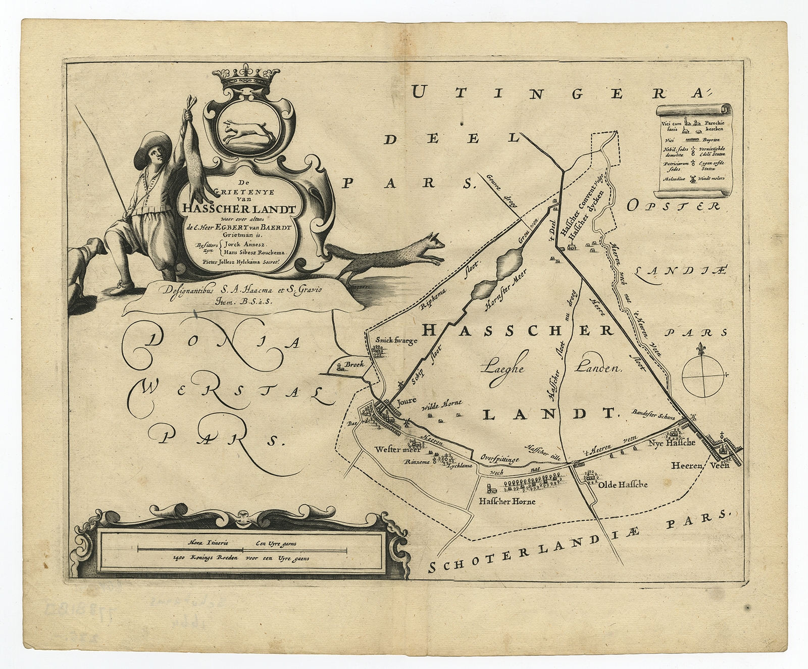 Antique Map of the region of Haskerland by Schotanus (1664) $ 228.91 Availability: in stock Condition : Good, given age. Edges with an occasional tiny tear. A few small spots, mainly in the margins. A few minor crinkles, mainly in the margins. Original middle fold as issued. General age-related toning and/or occasional minor defects from handling. Please study image carefully. Date : 1664 Overall size : 37.5 x 31 cm. Image size : 33 x 25.2 cm. Description: Antique map titled 'De Grietenije van Hasscher Landt (..)'. Map of the Grietenij of Haskerland, Friesland, The Netherlands. Multiple cartouches, key and coat of arms. Originates from "Beschrijvinge ende nieuwe caerten van de Heerlyckheydt van Frieslandt (…).", by Schotanus a Sterringa, first published in 1664. |