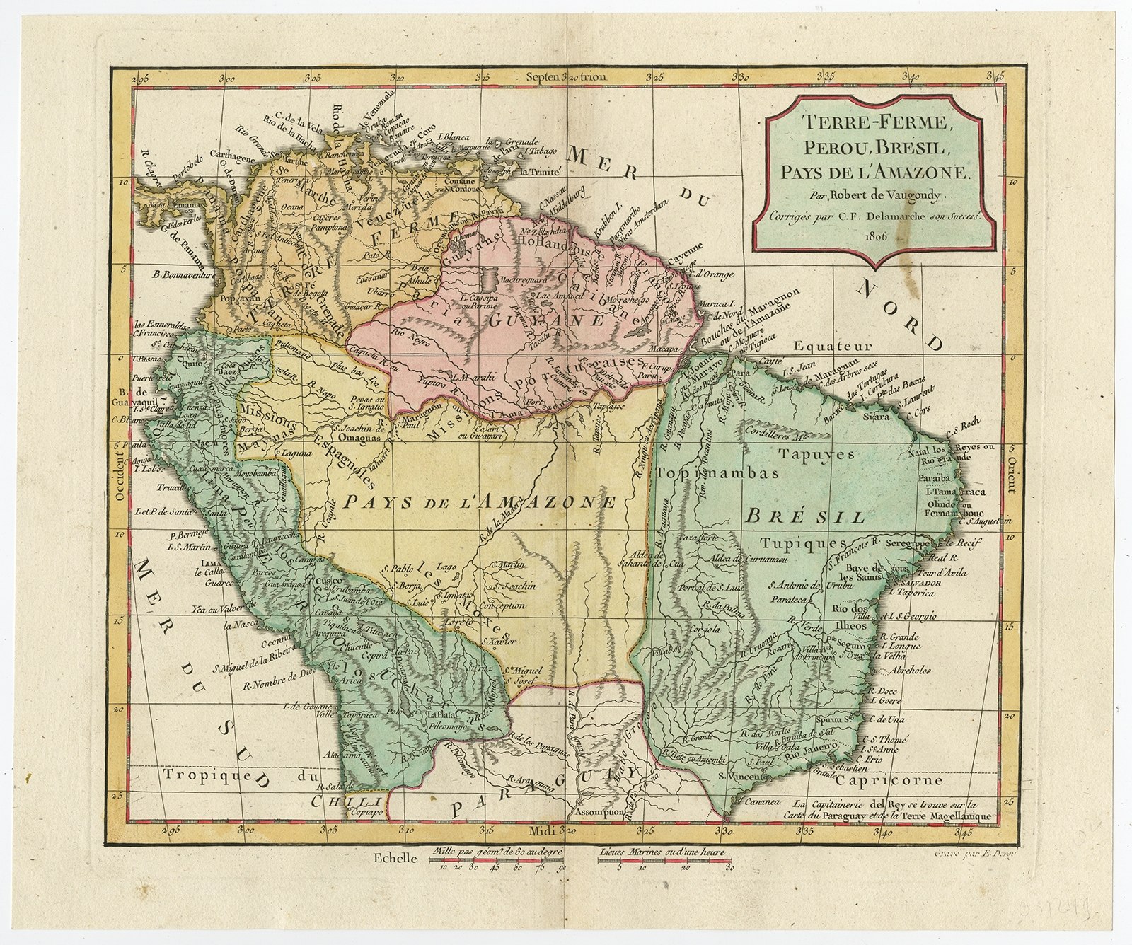 Antique Map of the northern part of South America by Delamarche (1806) $ 205.37 Availability: in stock Condition : Good, given age. Small stain cartouche area upper right. Original middle fold as issued. General age-related toning and/or occasional minor defects from handling. Please study image carefully. Date : 1806 Overall size : 34 x 28.3 cm. Image size : 28.3 x 24.8 cm. Description: Antique map titled 'Terre-Ferme, Perou, Bresil, Pays de L'Amazone.' This map shows the northern part of South America with Peru, Brazil, Guyana etc. By Robert de Vaugondy, revised and published by Delamarche. Source unknown, to be determined. Artists and Engravers: Charles Francois Delamarche (1740-1817) founded the important and prolific Paris based Maison Delamarche map publishing firm in the late 18th century. A lawyer by trade Delamarche entered the map business with the acquisition from Jean-Baptiste Fortin of Robert de Vaugondy's map plates and copyrights and later addes many plates from other sources as well. Charles Delamarche eventually passed control of the firm to his son Felix Delamarche (18th C. - 1st half 19th C.) and geographer Charles Dien (1809-1870). It was later passed on to Alexandre Delamarche, who revised and reissued several Delamarche publications in the mid-19th century. The firm continued to publish maps and globes until the middle part of the 19th century. |