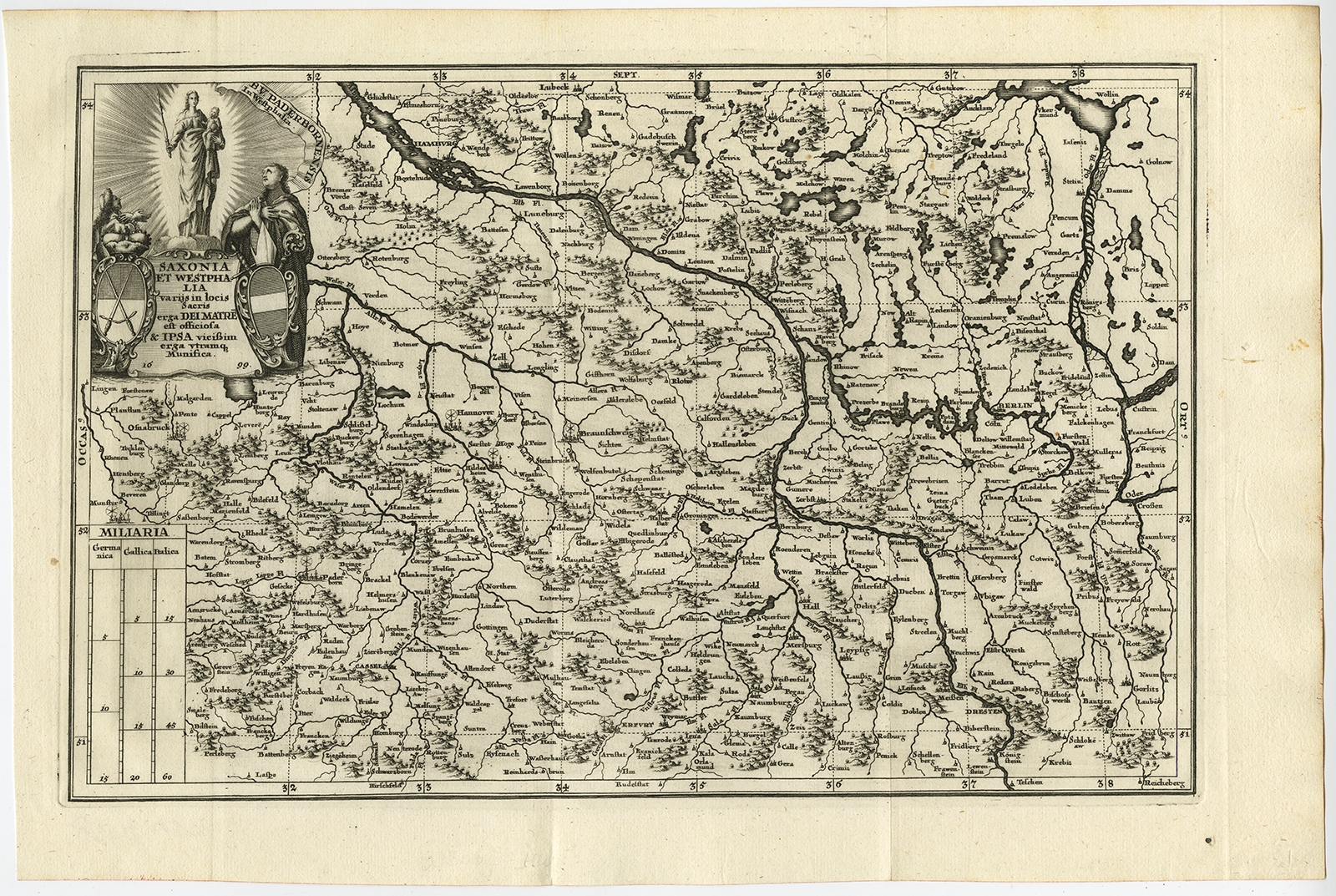 Antique Map of Saxony and Westphalia by Scherer (1699) $ 264.21 instead of Availability: in stock Condition : Very good, given age. Original folds as issued. General age-related toning and/or occasional minor defects from handling. Please study image carefully. Date : 1699 Overall size : 41 x 27.3 cm. Image size : 35 x 22.8 cm. Description: Antique map titled 'Saxonia et Westphalia varijs in locis sacris erga dei matre est officiosa & ipsa vicissim erga utramq. Munifica.' Detailed uncommon map of Saxony and Westphalia in Germany. Source unknown, to be determined. Artists and Engravers: Heinrich Scherer (1628-1704) was a Professor of Hebrew, Mathematics and Ethics at the University of Dillingen until about 1680. Thereafter he obtained important positions as Official Tutor to the Royal Princes of Mantua and Bavaria. It was during his time in Munich as Tutor to the Princely house of Bavaria that his lifetime’s work as a cartographer received acclaim and recognition. Scherer’s world atlas, the Atlas Novus, first published in Munich between 1702 and 1710 and reissued in a second edition between 1730 and 1737, forms a singularly unusual, almost revolutionary work in terms of the development of European mapmaking at the beginning of the 18th Century. |
