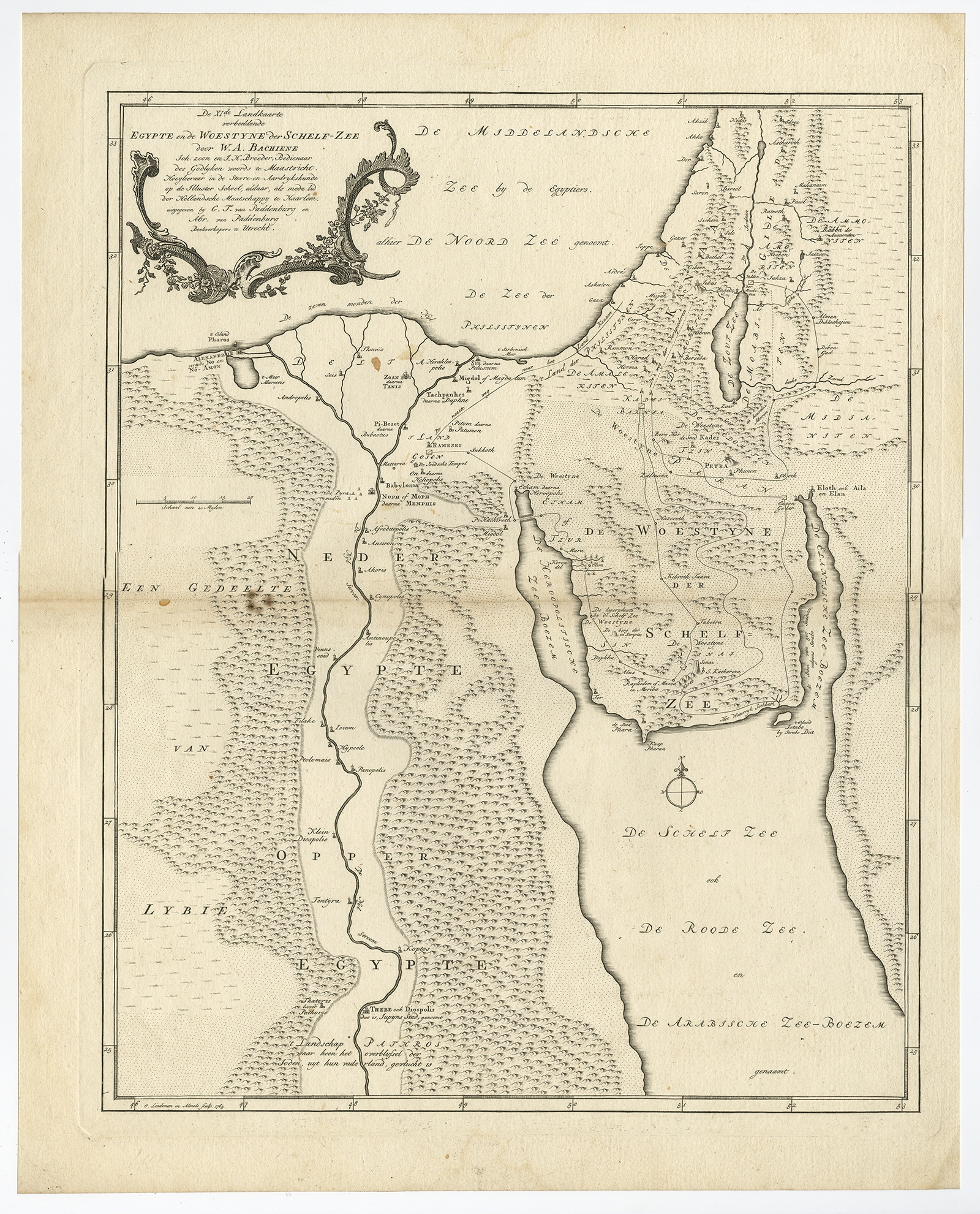 Antique Map of Egypt and the Red Sea by Bachiene (1765) $ 205.37 Availability: in stock Condition : Fair, given age. Slight discolouration of middle fold. A few brown spots. Original middle fold as issued. General age-related toning and/or occasional minor defects from handling. Please study image carefully. Date : 1765 Overall size : 38.7 x 48.6 cm. Image size : 33.5 x 42 cm. Description: Antique map titled 'De XIde Landkaart verbeeldende Egypte en de Woestyne der Schelf-Zee (..).' Map of Biblical Egypt and the Red Sea. With title cartouche, compass rose and scale. This map originates from 'Heilige Geographie of aardrykskundige beschrijving van alle de landen, enz., in de H.S. voorkomende. Behelzende eene beschryving des Joodschen Lands eertyds Kanaan' by W.A. Bachiene. Artists and Engravers: Published by A. van Paddenburg. |