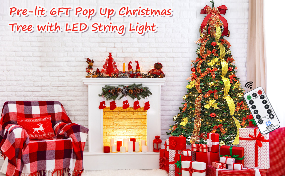 Prelit 6FT Pop Up Christmas Tree with Bows and Red & Gold Christmas Balls Ornaments Decorations Christmas holiday decorations tree perfect for the home, living room, hallways, bedrooms, Xmas party, office, fireplace, supermarket, enter the way, window, wedding, any indoor and covered outdoor use. |