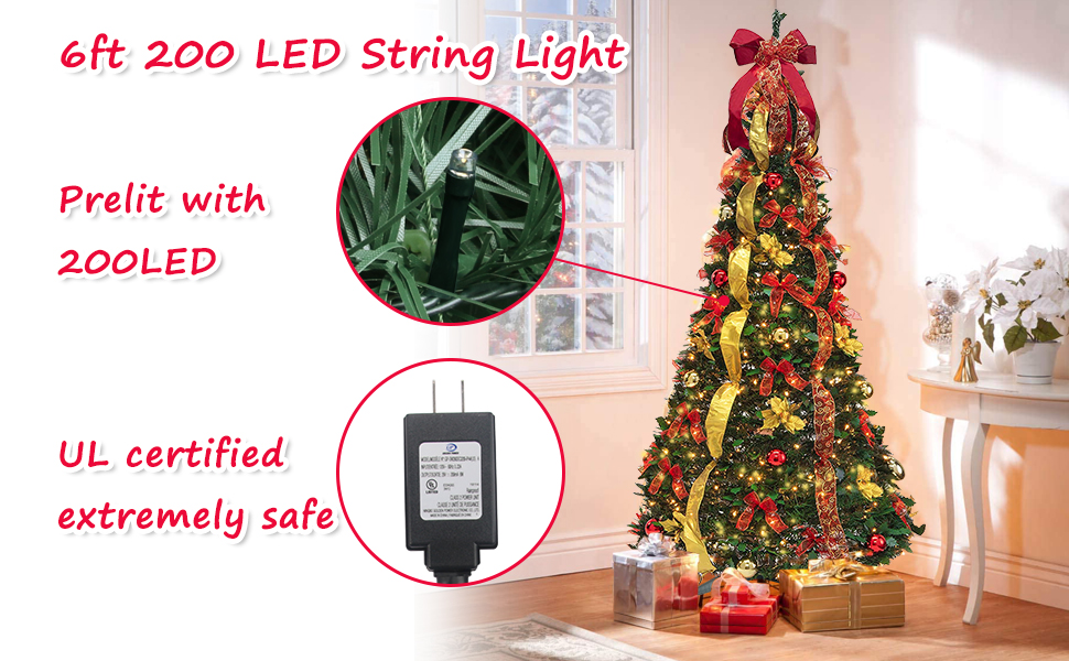 【Pre-lit Christmas Tree】Comes with UL-certified 200 warm white LED lights evenly distributed throughout the tree, so you don't need to buy additional LED strings to decorate.