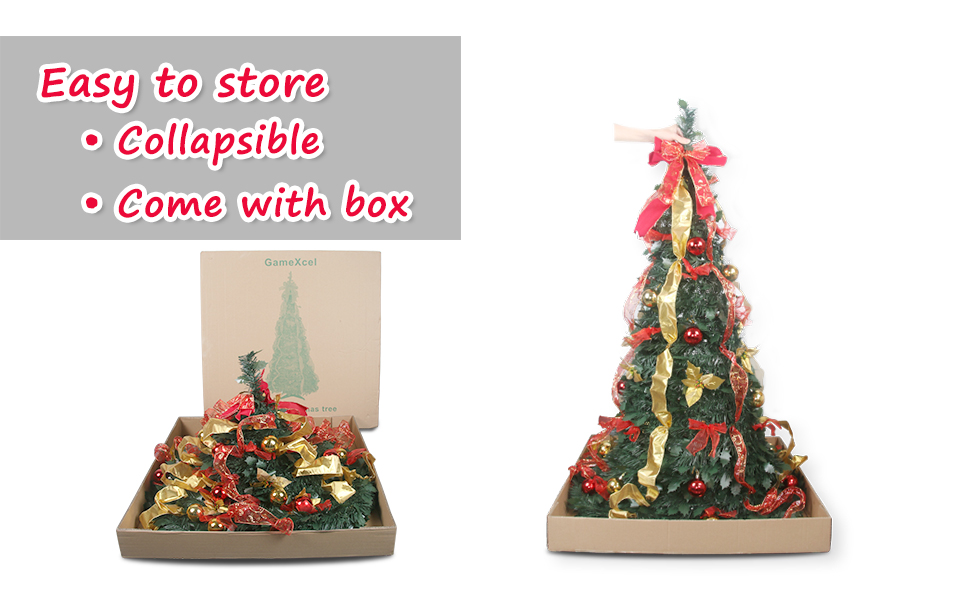 【Easy to Install and Storage】Christmas tree is a pull-up design; Without tools, you can easily install or disassemble it into several parts in 5 minutes. When you do not use the Xmas tree, it collapses for easy storage and can be put in a box. Easy and convenient.