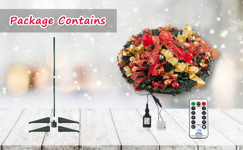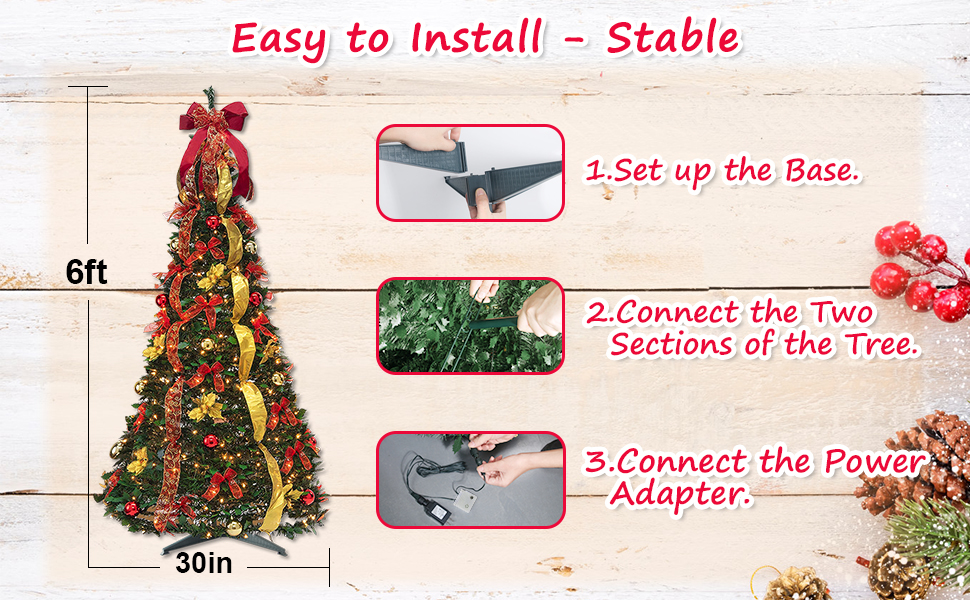 【Fully Decorated】The collapsible Christmas tree is pre-decorated with Led string lights, red&gold french ribbon, flowers, bows, and Christmas ball ornaments. It can save the time and expense of buying additional decorations.