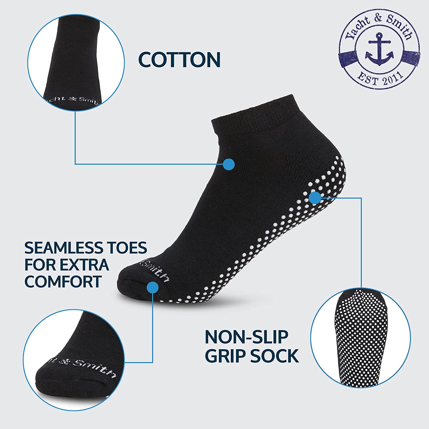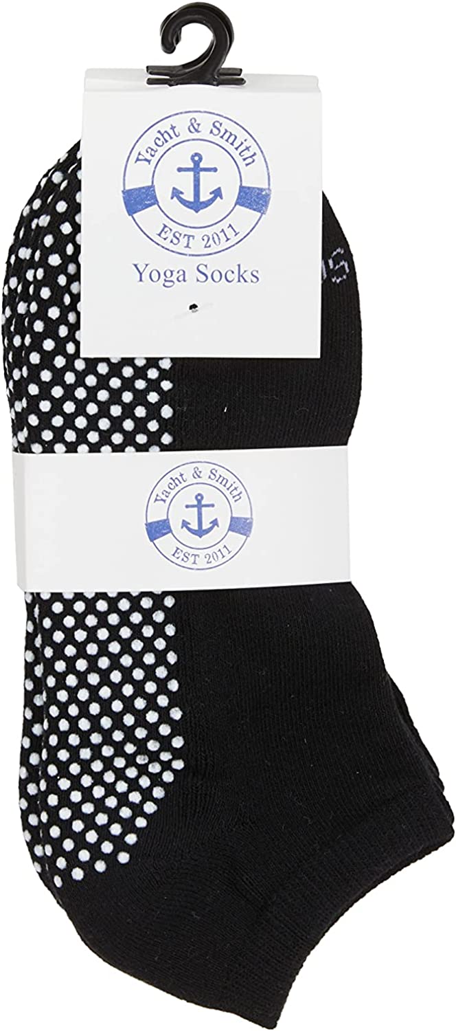 WOMENS 97% COTTON YOGA SOCKS: Excellent choice for those who practice pilates, barre, yoga, trampoline jumping, or just walking around on smooth surfaces like tiles or wooden floors! NONSKID GRIPPER SOLES ON SOCK: Grippy soles are popular as hospital socks in medical settings as they prevent slips and falls more than socks that do not feature rubber grips.COLORFUL ARRAY OF SOCK COLORS IN YOUR DOZEN PACK:Receive a bulk 12 pair pack of our super soft thick cotton ankle socks. Ladies and teenagers love the fun colored assortment. 97% COTTON!Our socks stand out from others as we designed them to be comfortable and naturally breathable with our high cotton content. YACHT & SMITH BRAND:We offer bulk sock offerings across womens socks that generate the most value for you!