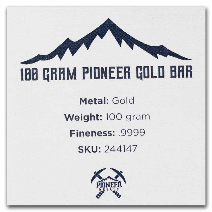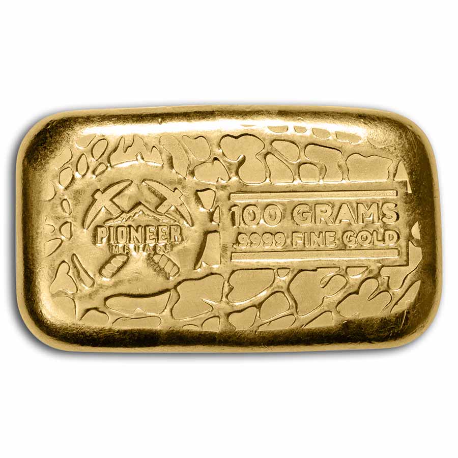 With our Pioneer Metals line of Gold bars, we use only the finest grain quality during production, resulting in high-quality .9999 fine Gold products. Find the current Gold price per gram and add the Pioneer Metals 100 gram Gold bar to your cart today!