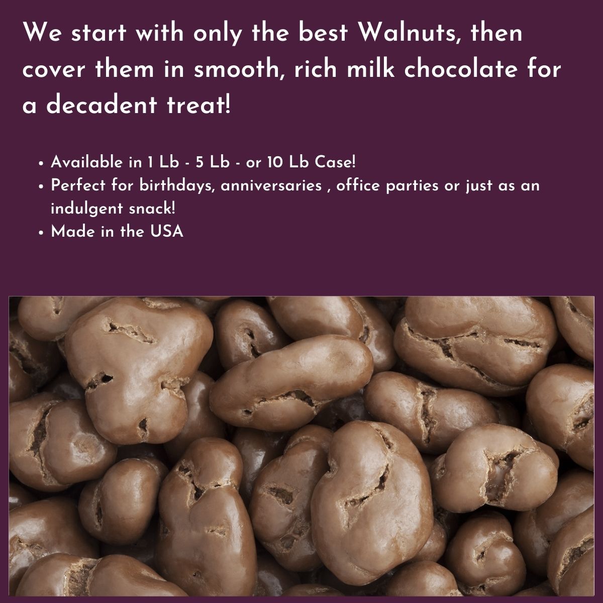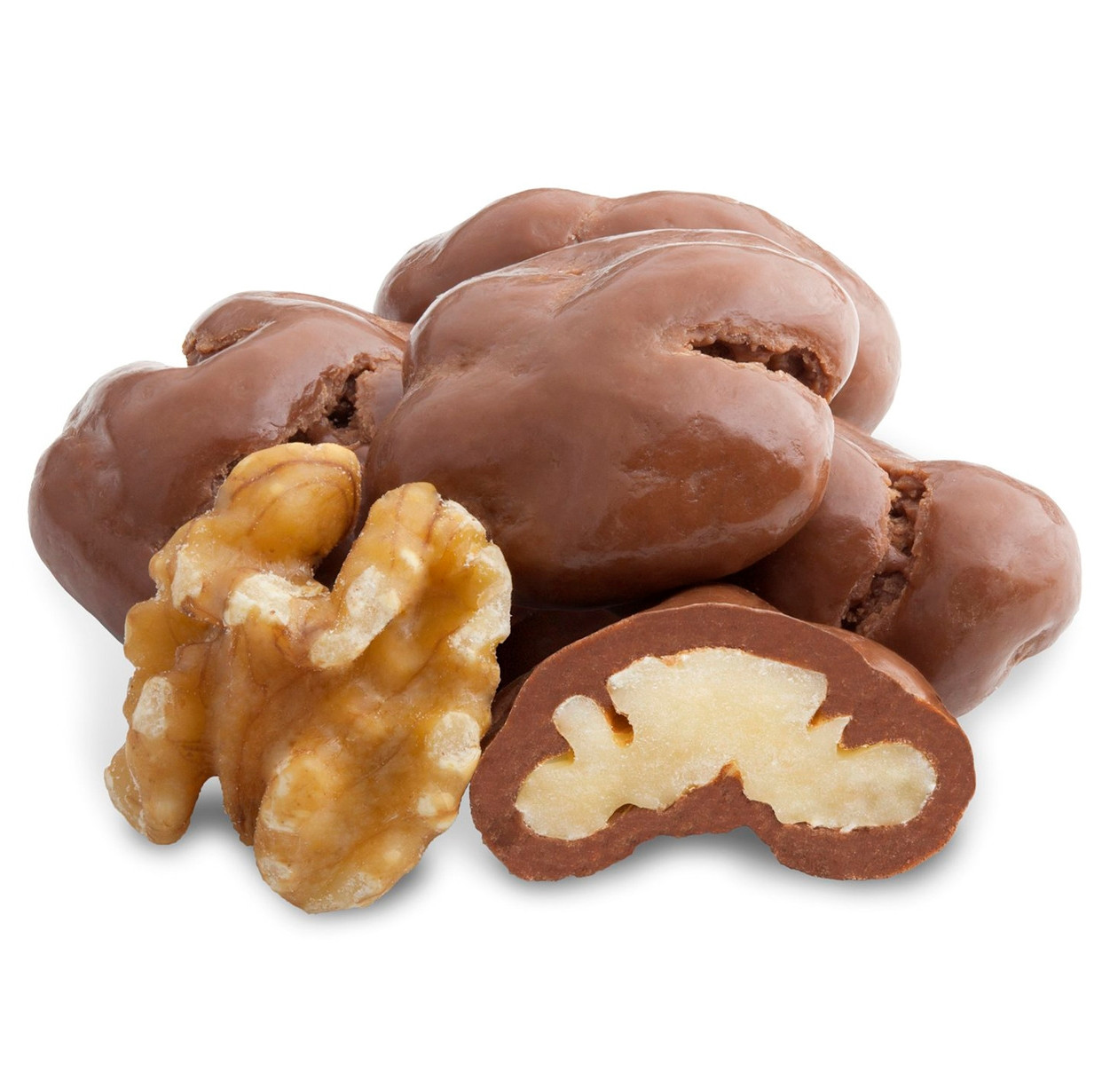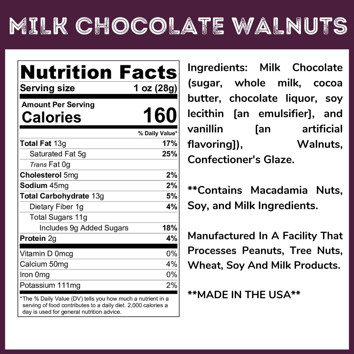 Ingredients: Milk Chocolate (sugar, whole milk, cocoa butter, chocolate liquor, soy lecithin [an emulsifier], and vanillin [an artificial flavoring]), Walnuts, Confectioner's Glaze.