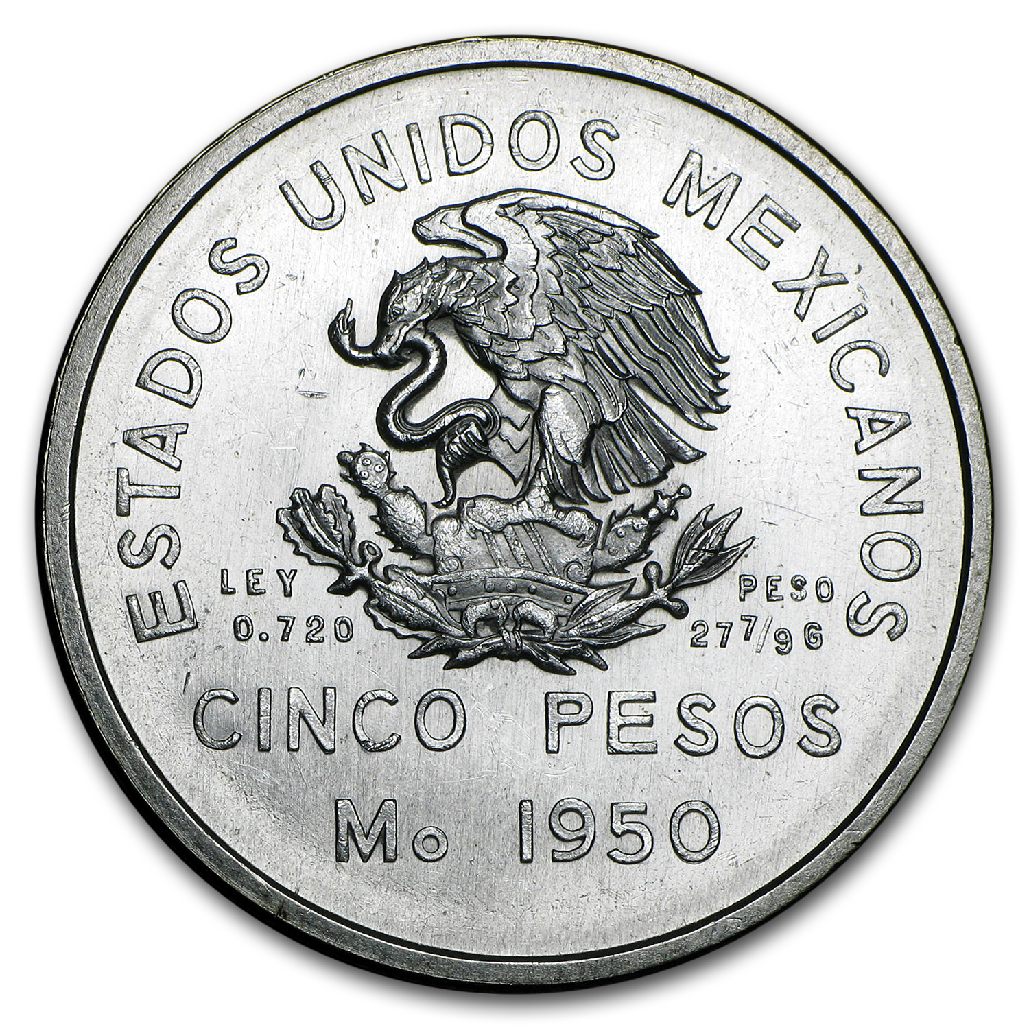 - Obverse: The Mexican national coat of arms as depicted on the standard circulating 5 peso of the time, with denomination and date below, flanked by legends of weight and purity.