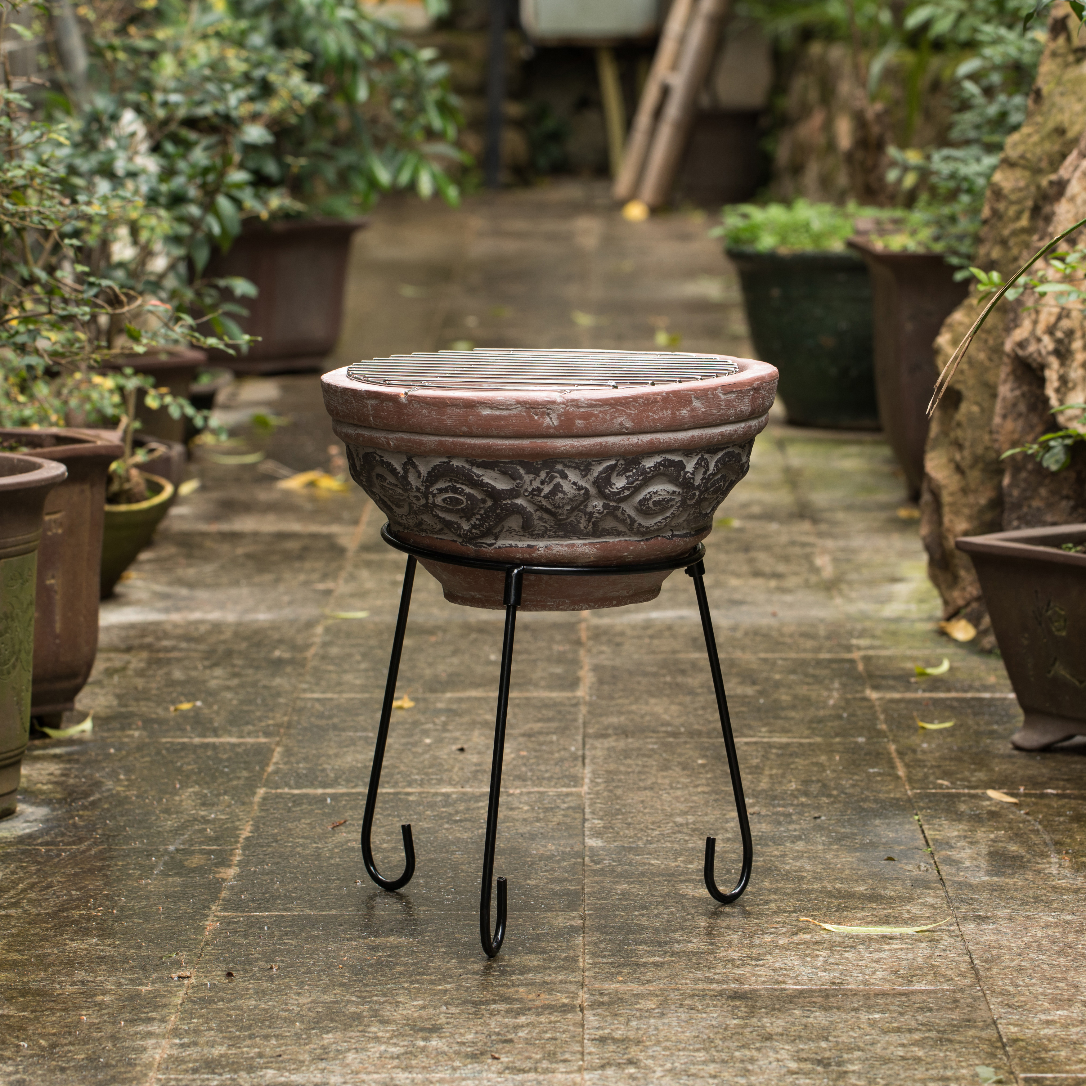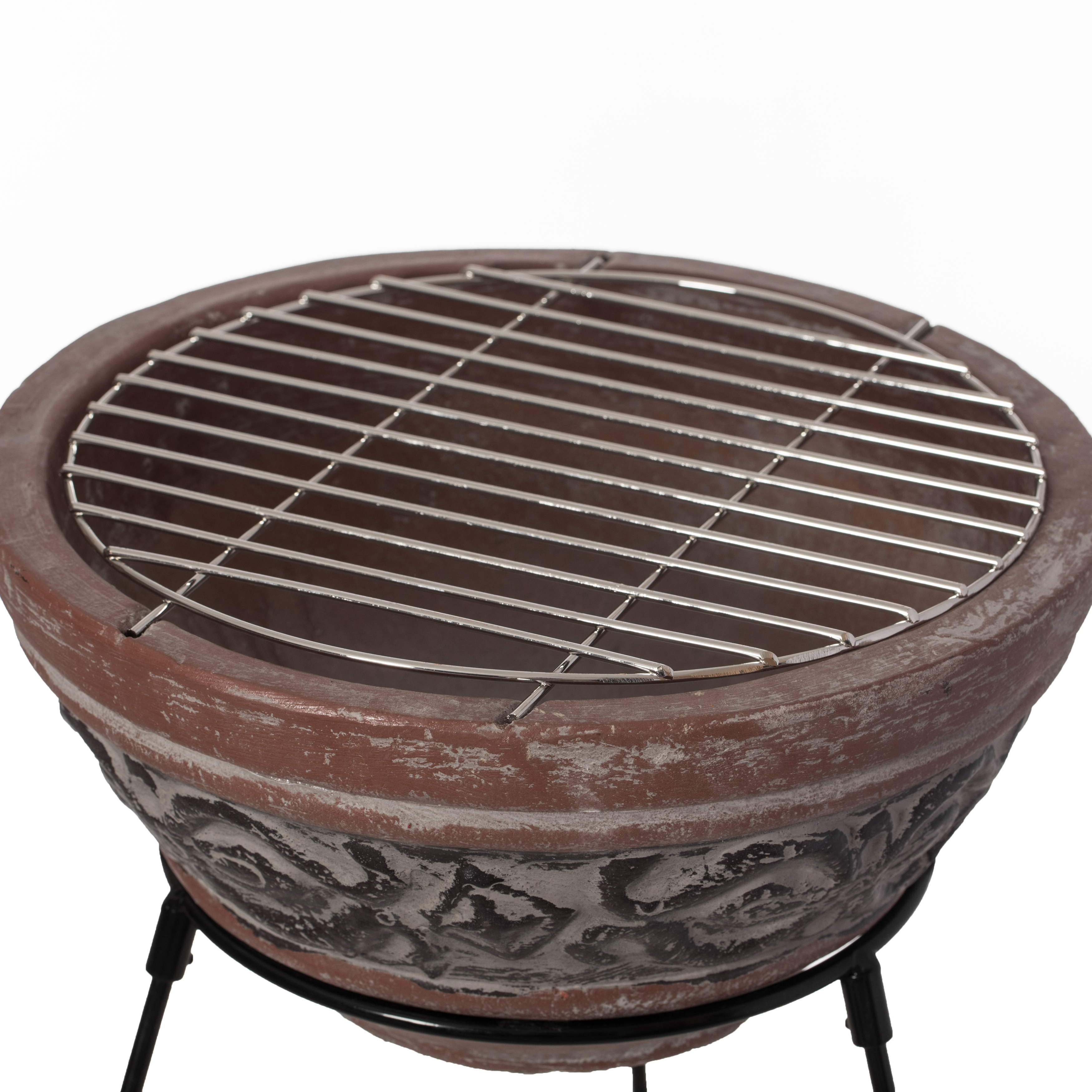 Experience the ultimate backyard retreat with our accent clay charcoal fire pit and sturdy metal stand. It has a simple design, but it is striking and attractive. Get ready to entertain your guests in style with our eye-catching outdoor firepit. The accent finish gives this fireplace a contemporary look. Decorate your lawn and garden while adding a warm and cozy vintage charm. Use it to grill food on it, light a fire, or simply as a decorative accent.