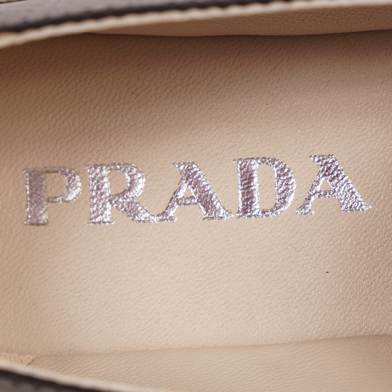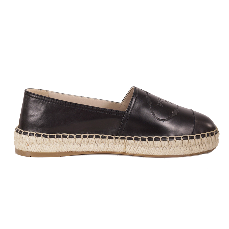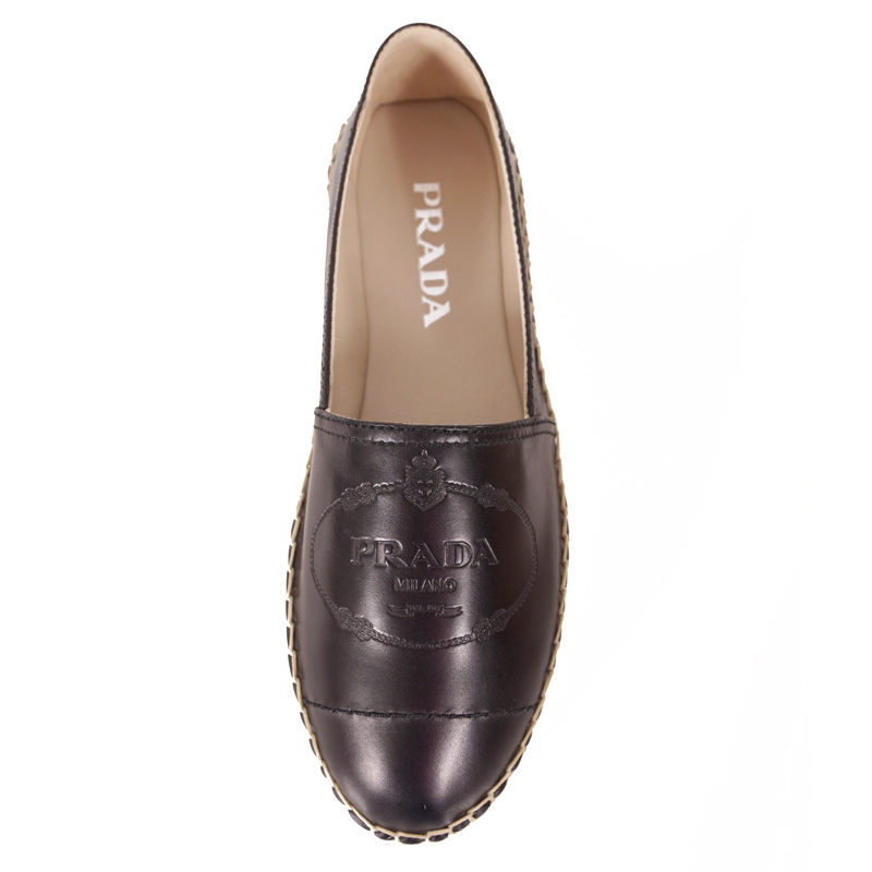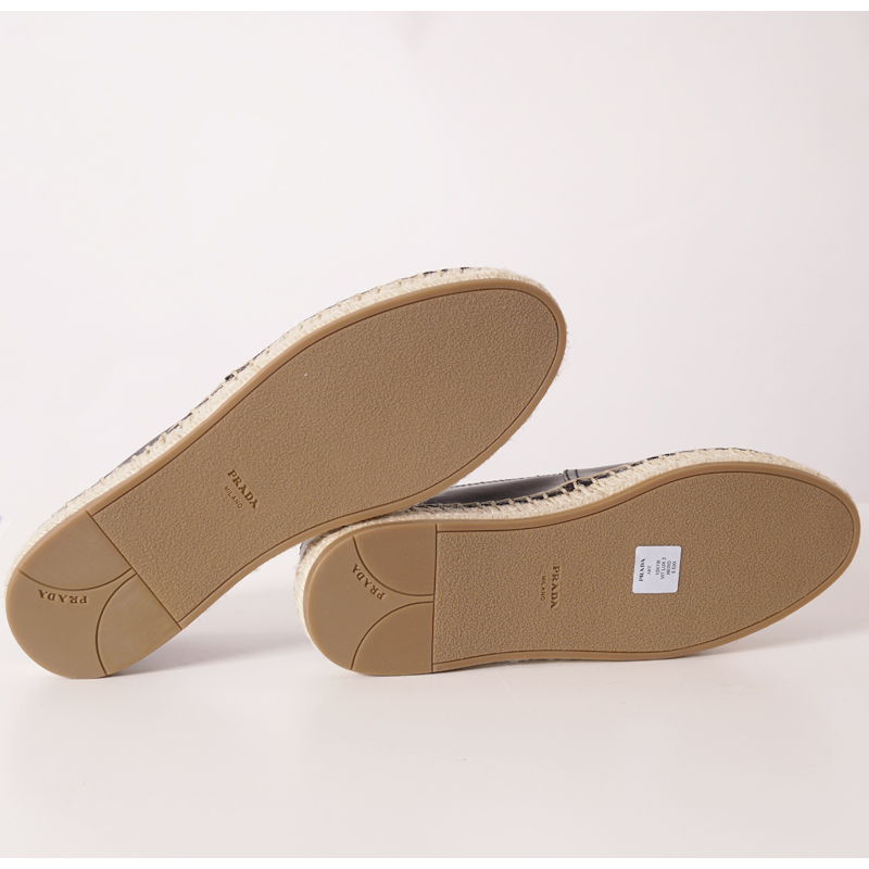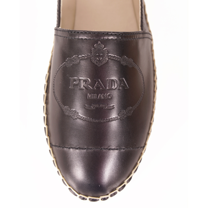 Authentic Prada flats in a sleek style for spring and summer. Black leather with classic Prada crest embossed logo in front. Slip-on style. Round toe. Beige raffia espadrille mid sole. Rubber sole. Style 1S619I. Made in Italy. Great weekend shoes, pairs with shorts to jeans.