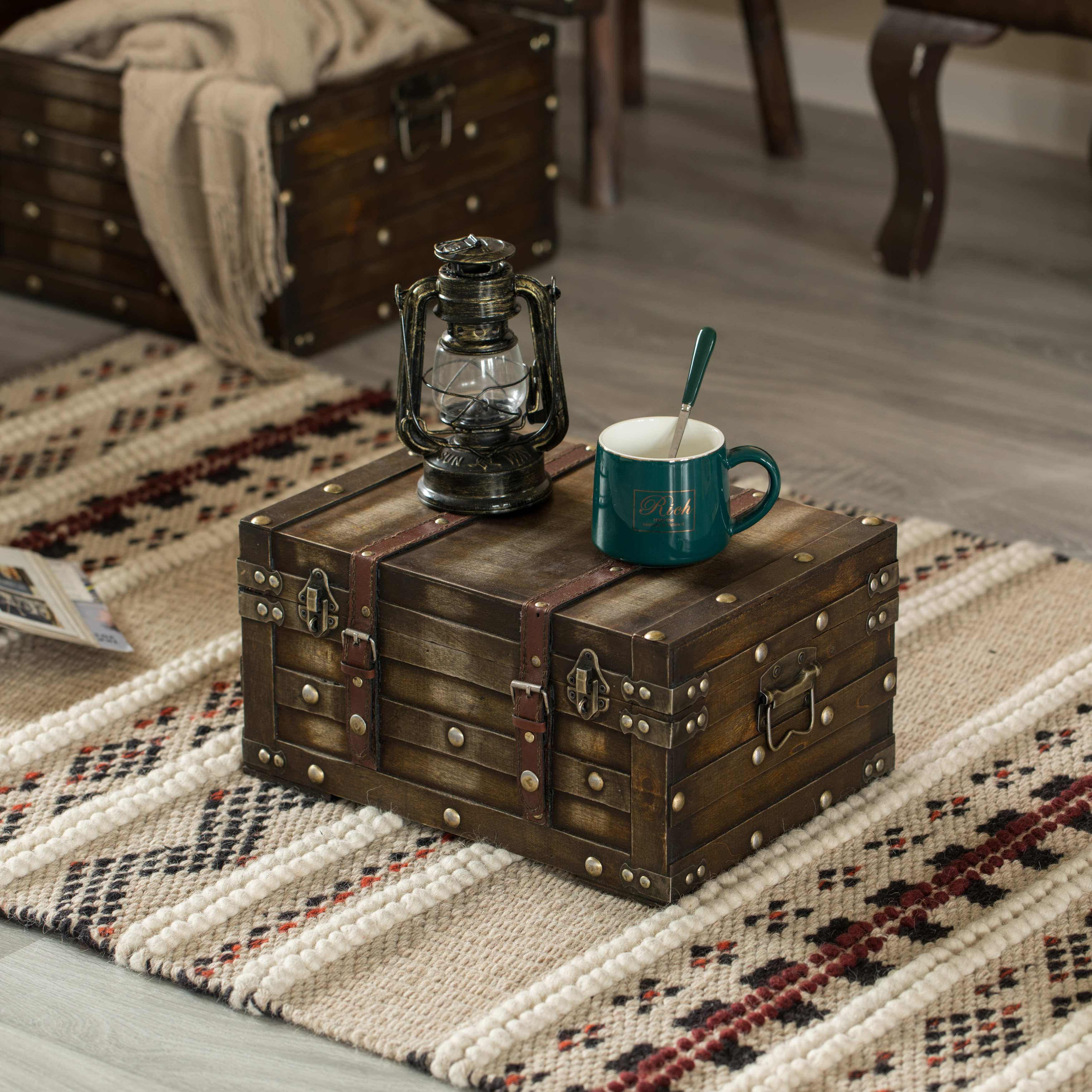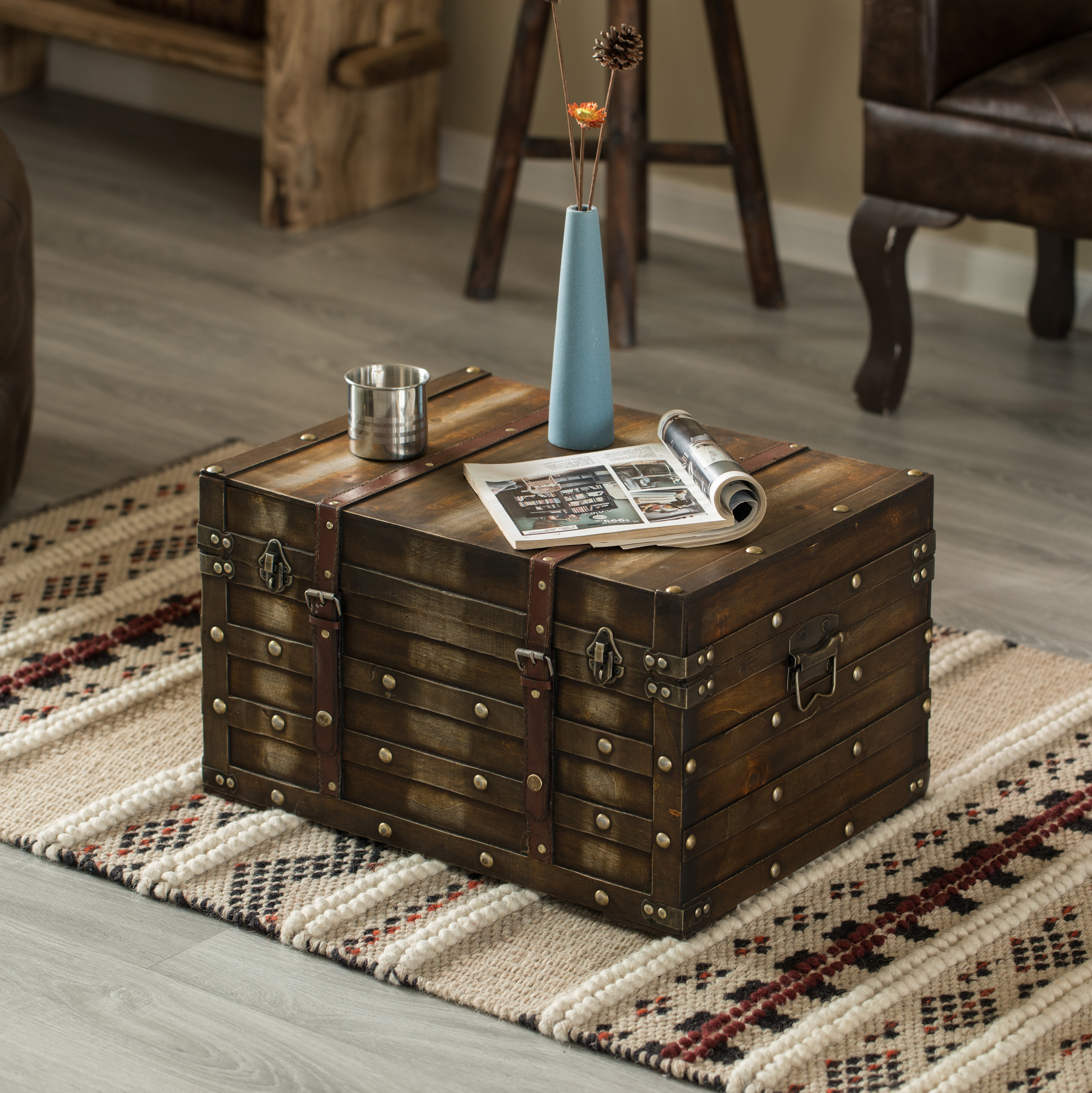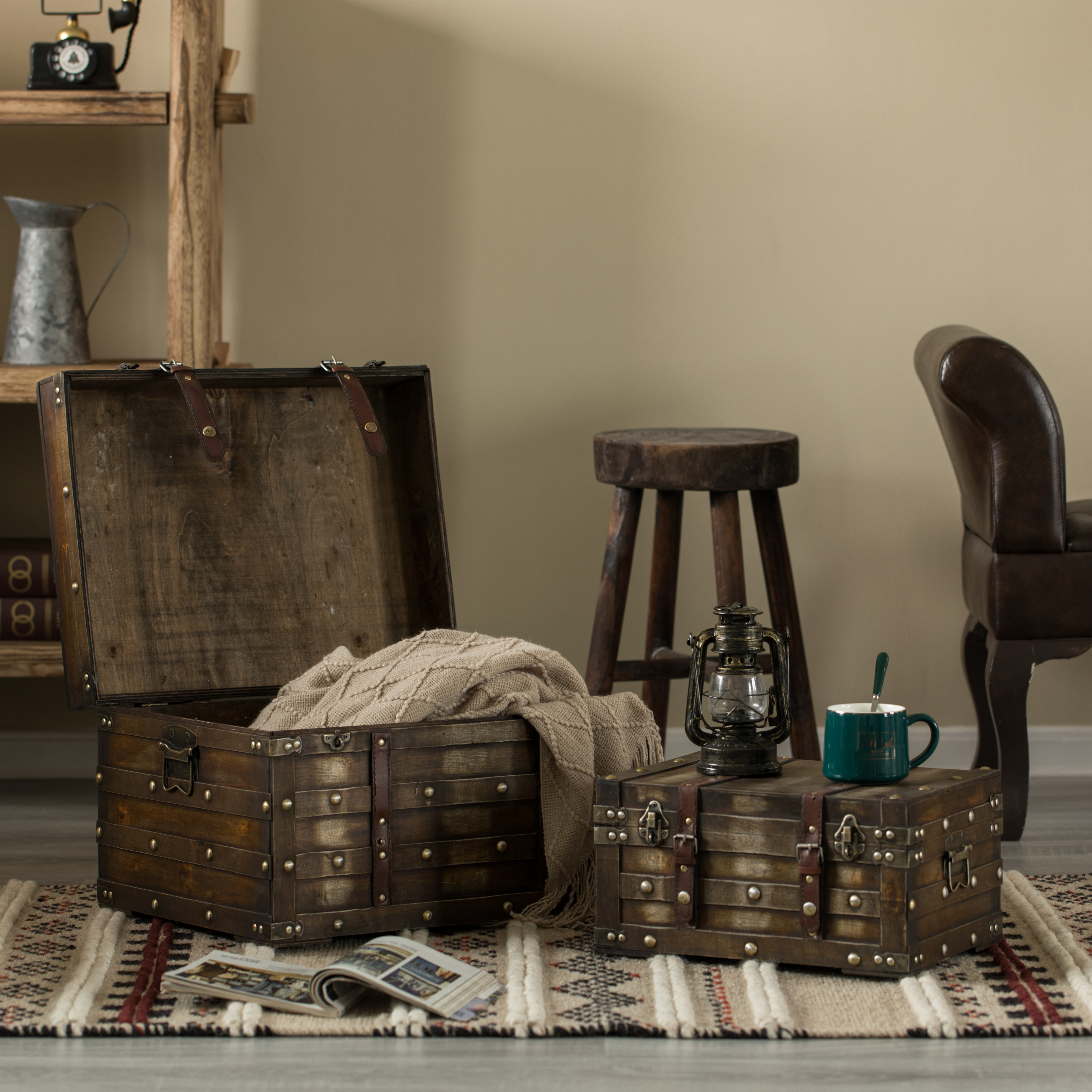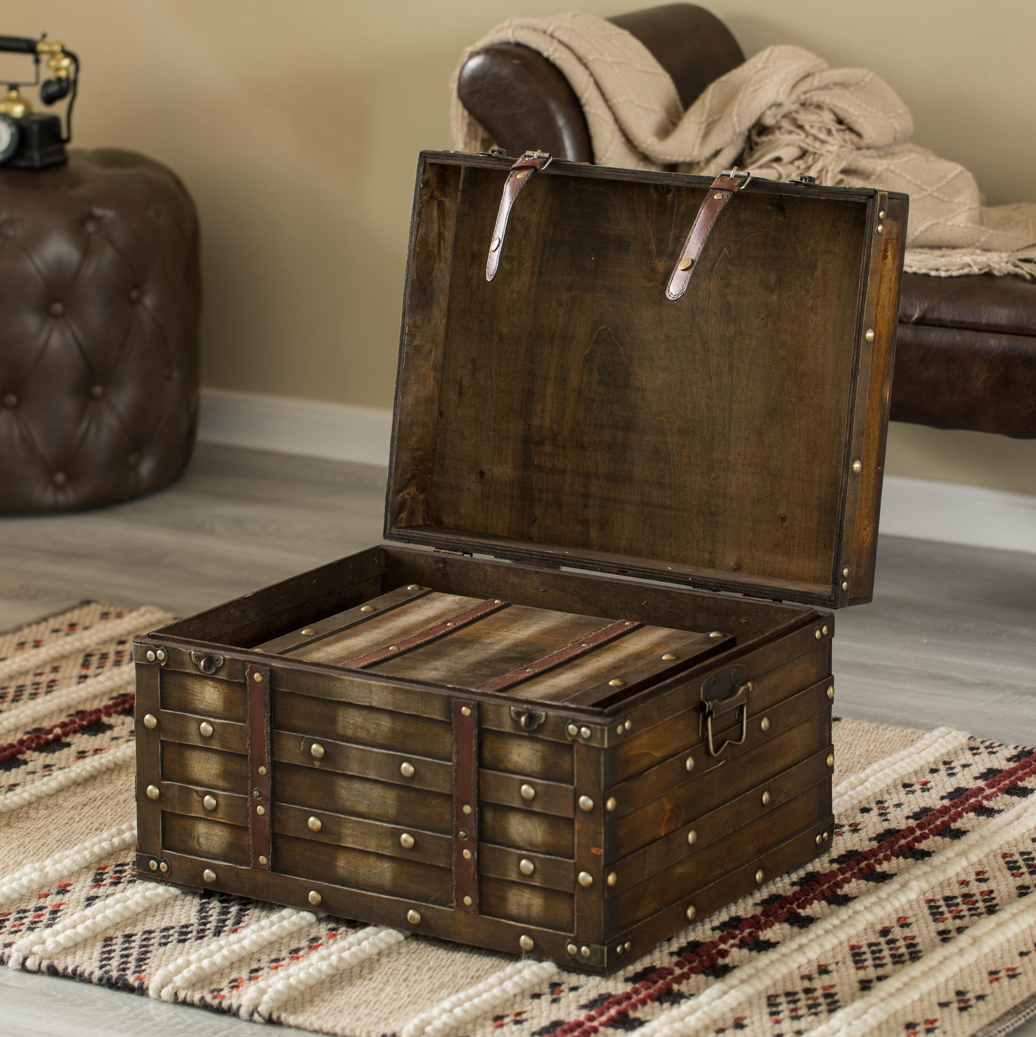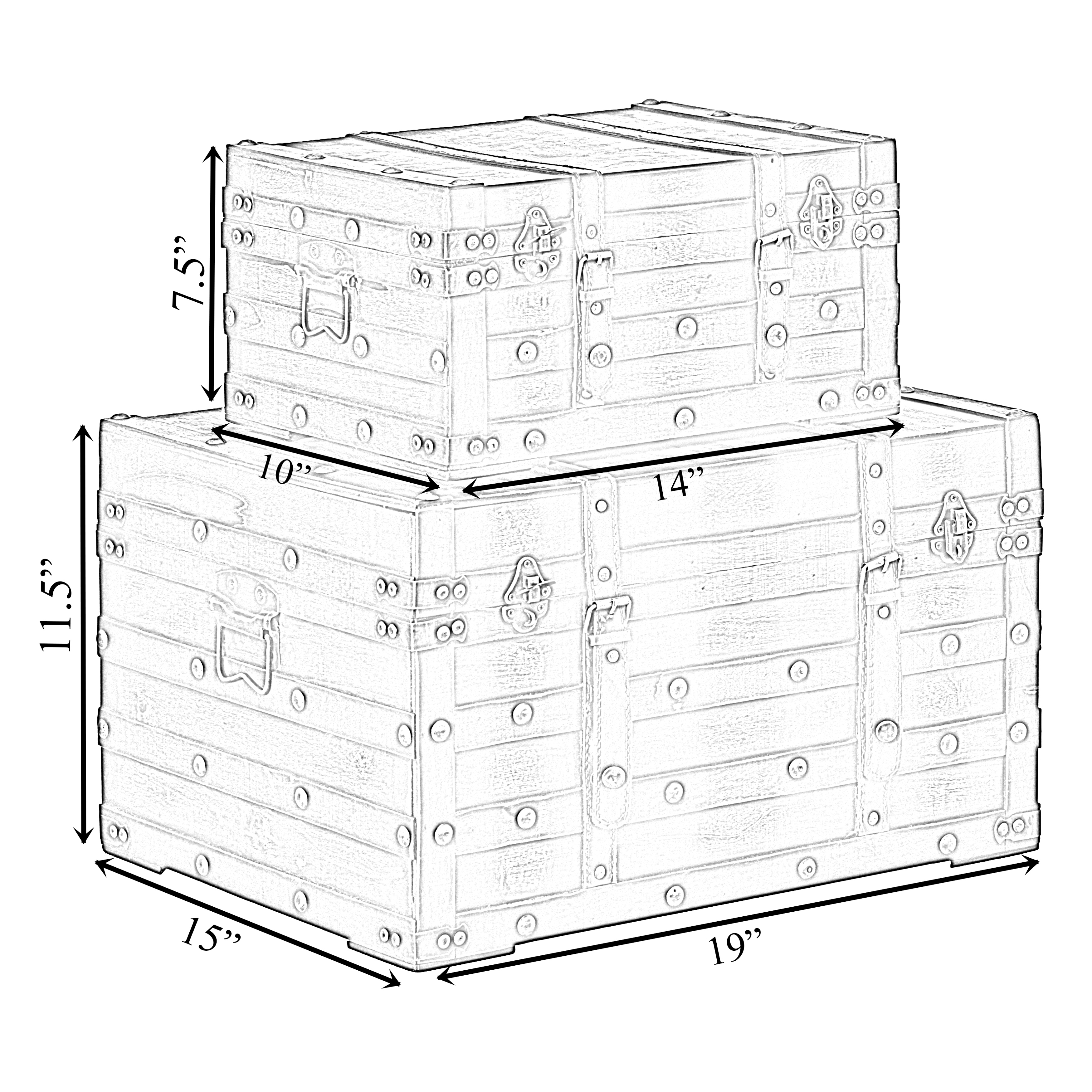 These sturdy trunks look fabulous as a decorative accent, stacked beside a sofa or chair, and can also be displayed individually on a shelf, dresser, desk, or beneath a glass coffee table. Each nesting trunk offers great storage and features practical handles, making them easy to carry from one location to another. These trunks can hold everything from clothing and books to small electronics and documents. Can hold up to 40 lbs.