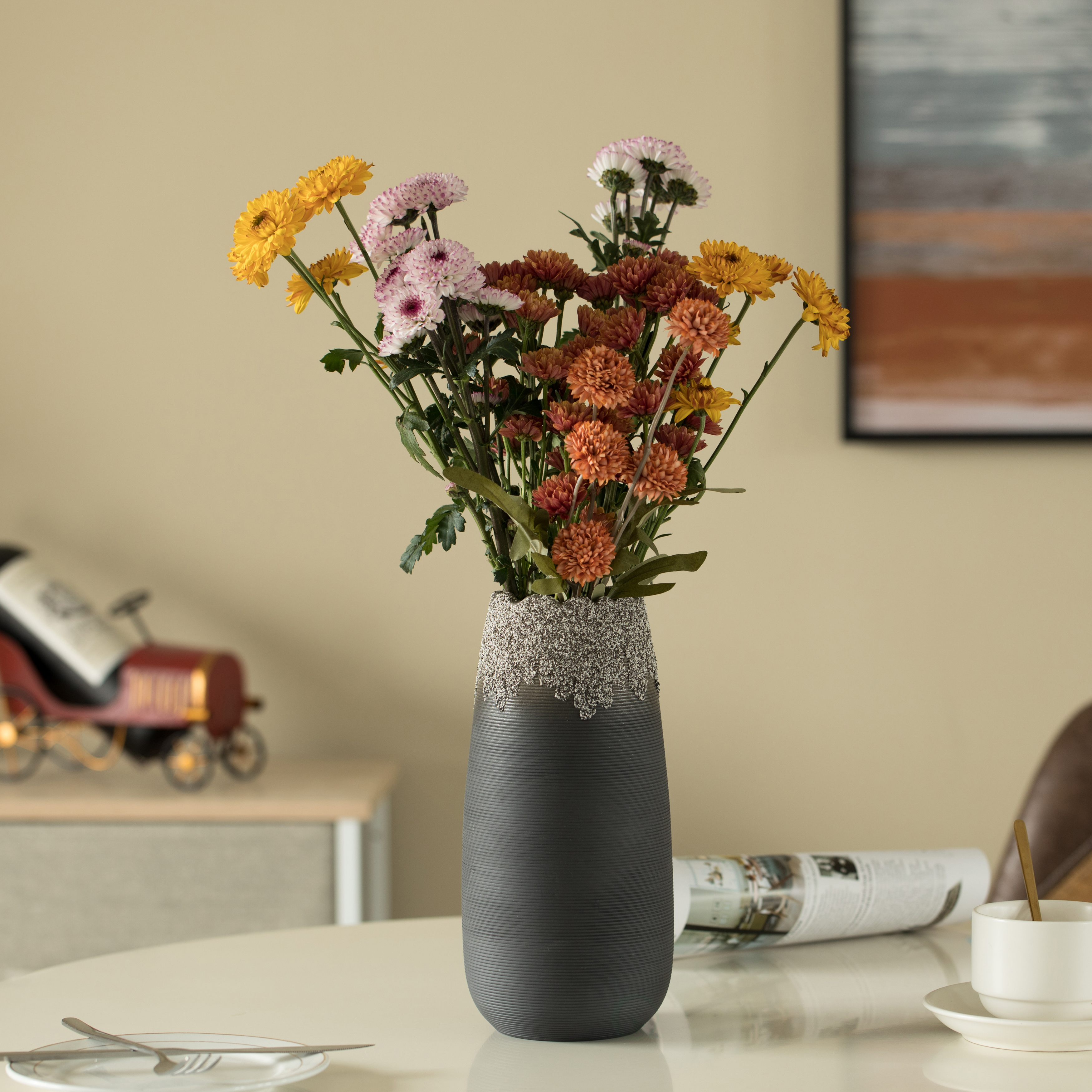 This modern table flower vase adds an elegant touch and beautiful art to your home. It is made of 100% ceramic material with a unique modern pleated vase design. The exclusive qualities of the floor vases, such as modern style, and sturdy design will complete the look of any room. The vase was composed of a high-quality, sturdy Ceramic material for long-lasting strength and durability, so it will design your home for many years to come. This centerpiece is completely watertight, with no drainage hole to keep your flowers fresh. Ideal to use as a flower vase, statue, table centerpiece, or even as a modern desktop organizer to accommodate your specific needs. Whether you place it in your hallway, entryway, dining room, living room, or in any room corner, this vase is sure to make a statement and add a touch of elegance to your space. Suitable for various fillers such as dried or silk flowers, branches, feathers, or pearls. This vase is a true masterpiece and is sure to make a statement and impress your guests, and it’ll bring your home décor to the next level.