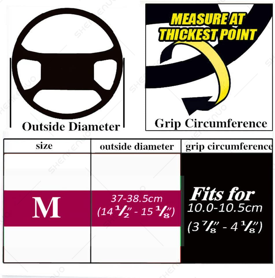 Steering Wheel Outer Diameter: 37-38cm(14.5"-15") cover size: 38cm(L) x 10.5cm(W) Compatible: Almost 90% car models with 37-38CM outside diameter steering wheel note, please make sure the size could fit your car before you buy,