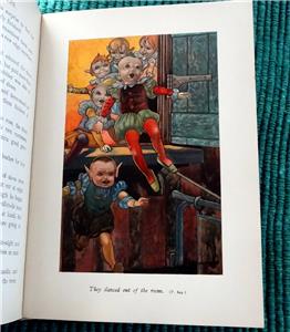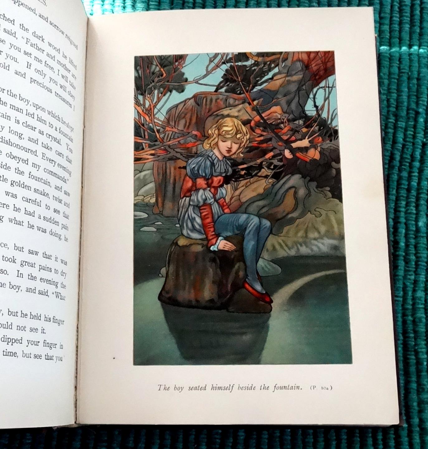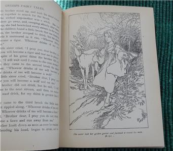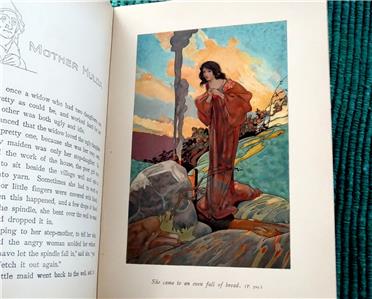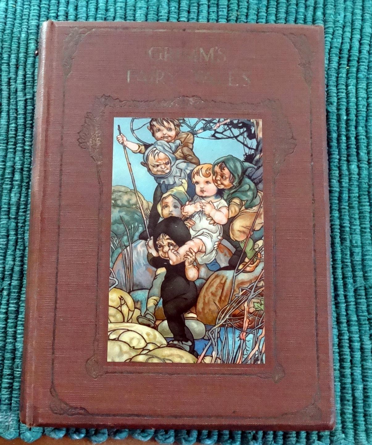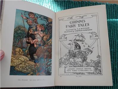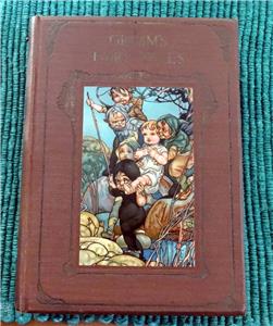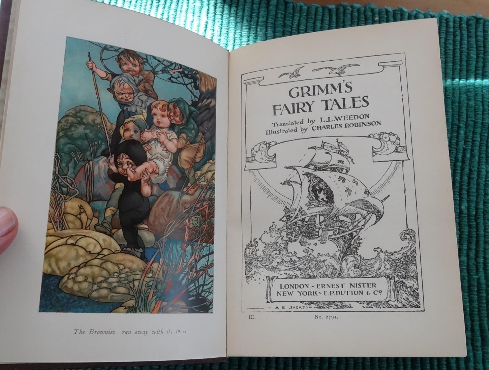 Grimm's Fairy Tales. Illustrated by Charles Robinson. Ernest Nister. [ND] 1910. First edition. Brown cloth boards with elaborate design and lettering stamped in gilt to front. Pictorial pastedown to front. Gilt design and lettering to spine. Four full page chromolithographs, with an additional one as front pastedown. B&W illustrations throughout, with some full page. Illustrated endpapers. Top edge tinted. Beveled edge. 8vo.