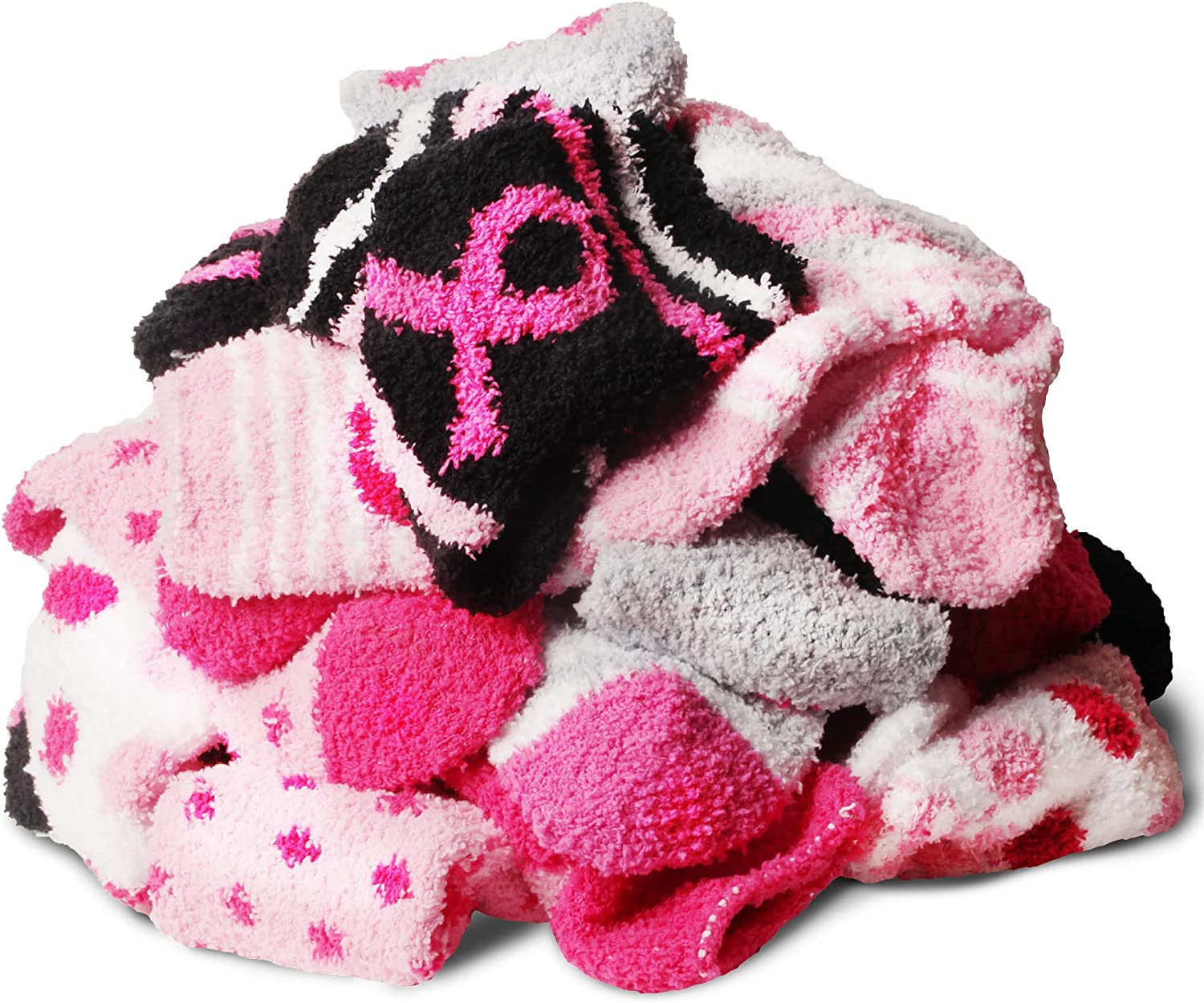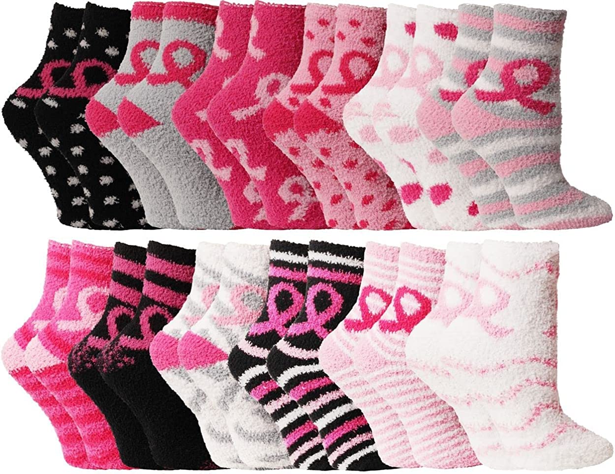 Comes in either crew length or ankle / low-cut length for various activities including soccer, softball, tennis, running, or everyday wear. Each pack includes 12 pairs of assorted colorful socks for women. Many assorted colors with pink ribbon print. Get colors including red, black, white, pink, and more! One size fits most women. Socks size 9-11 will fit womens shoe sizes 4-10. Acrylic provides warmth without being heavy. Easy to clean in washing machine regular cycle.