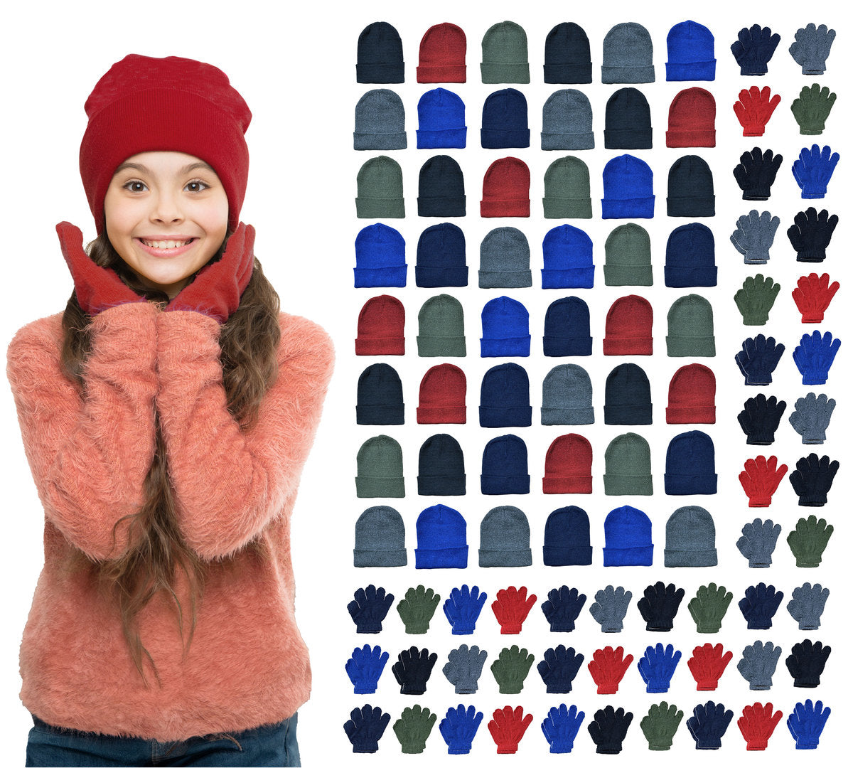 HAT & GLOVE SET FOR CHILDREN POPULAR FOR HOMELESS SHELTER DONATIONS: Get your little ones ready for winter with warm stretchy beanie hats and magic gloves in a variety of colors and styles. Durable knit construction and warm acrylic material is just right to keep your kids warm and toasty while they play outside. Bulk pack in assorted fun colors they will love! Buy a value pack and keep spare hats and gloves in the car or in their backpacks.Acrylic provides warmth without being heavy. Easy to clean in washing machine regular cycle.