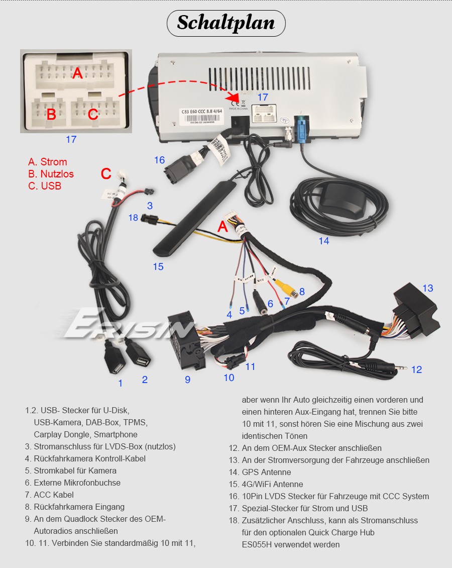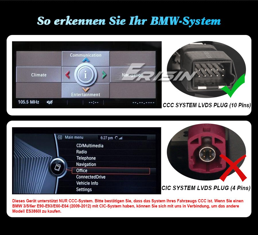 2. Dieses Gerät unterstützt NUR CCC-System. Bitte bestätigen Sie, dass das System Ihres Fahrzeugs CCC ist. Wenn Sie einen BMW 3/5/6er E90-E93/E60-E64 (2009-2012) mit CIC-System haben, können Sie sich mit uns in Verbindung, um das andere Modell ES3860I zu kaufen. für die Unterschieden zwischen CIC und CCC können Sie die folgenden Bilder durchzulesen.