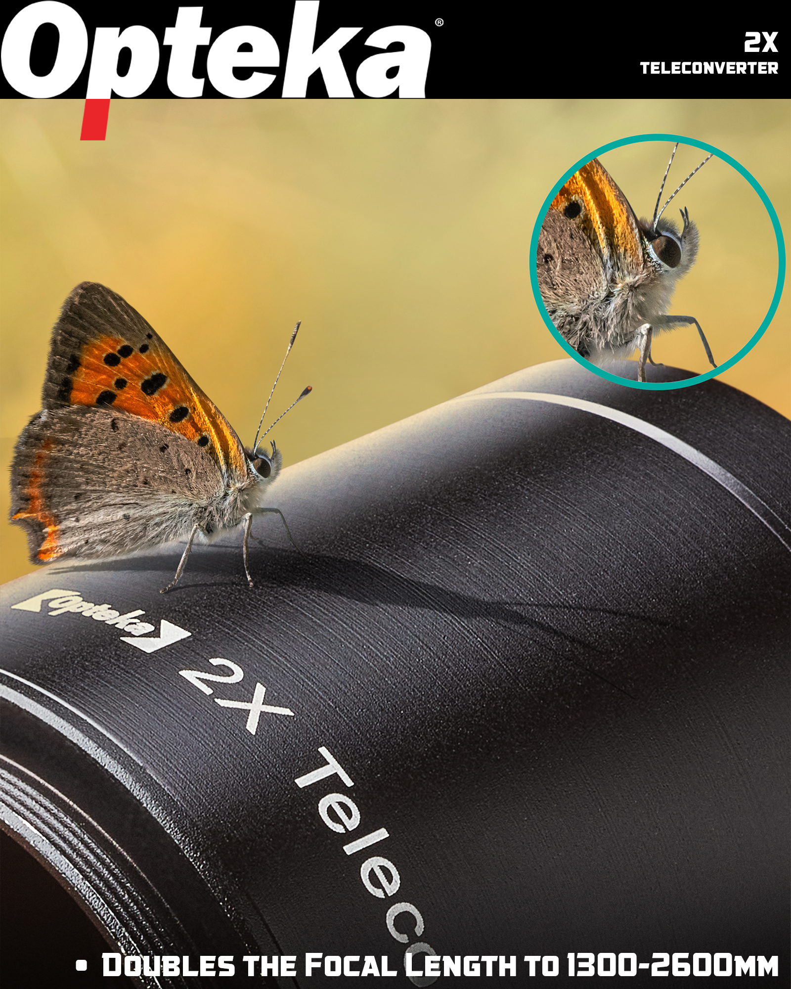 Spanning an impressive range of super telephoto focal lengths, the black 650-1300mm f/8 Telephoto Zoom Lens from Opteka is well-suited to photographing a variety of long-distance subjects. The Opteka 650-1300mm high definition manual focus super telephoto zoom lens is perfect for the professional and amateur photographer alike. Using the 2x tele-converter with a 650-1300mm lens will effectively increase the focal length to 1300-2600mm. There is a built-in, rotating tripod mount for easily attaching to your tripod or monopod. It's an extremely powerful telephoto zoom lens with the versatility that you need. This lens is great for the wildlife or nature photographer who wants to be hidden while taking photos of the subject. When combined with the included T-mount to fit your camera system, this super telephoto works on both "full frame" cameras as well as the "APS-C" DSLR cameras.