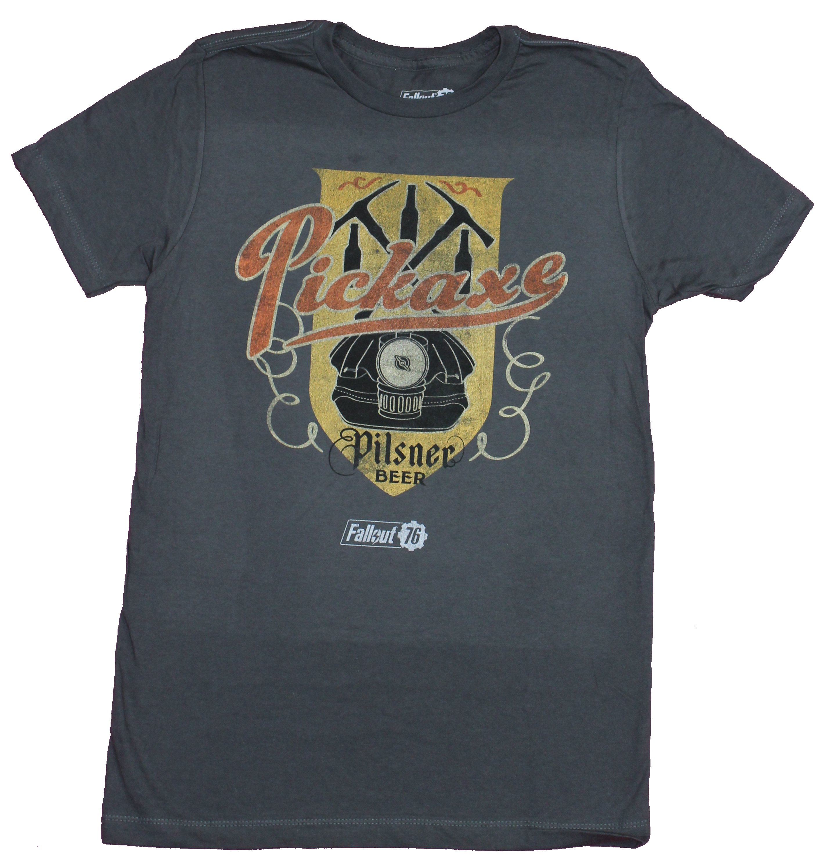 Fallout Adult New T-Shirt - Distressed 76 Pickaxe Pilsner Beer Label Pic