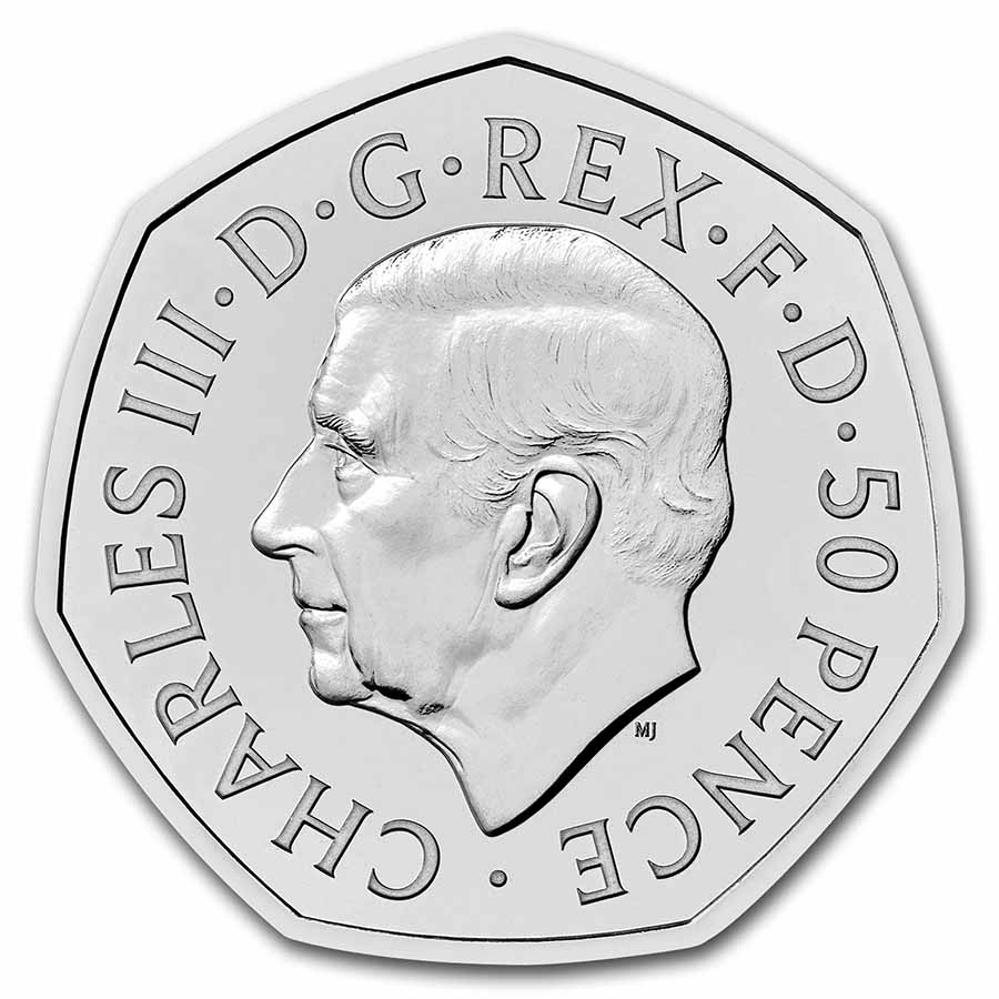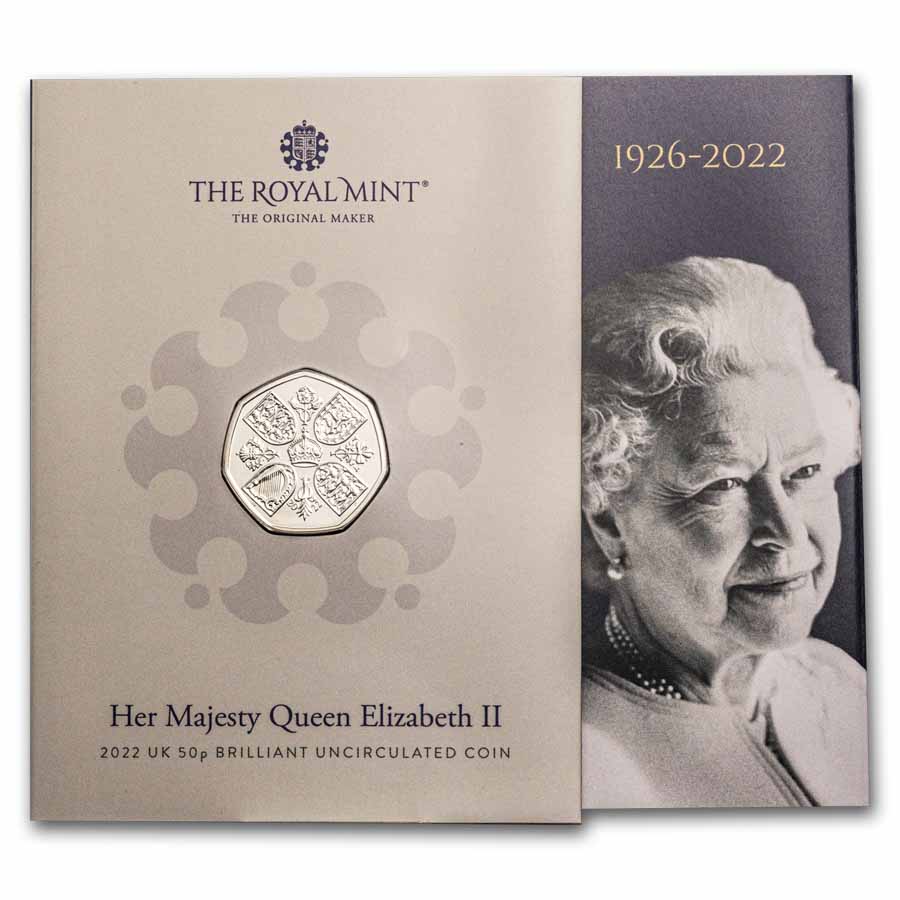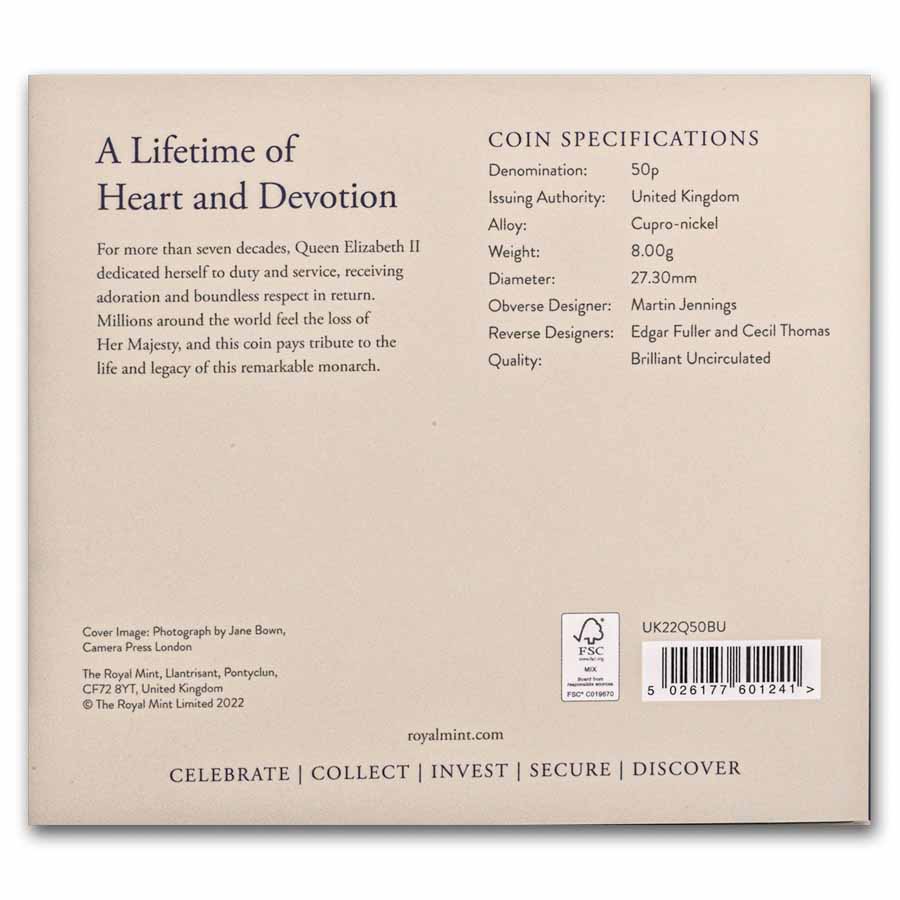 This cupro-nickel release honors the life and legacy of Her Late Majesty Queen Elizabeth and features the first effigy of His Majesty King Charles III. Add this 50 Pence BU coin of Her Majesty Queen Elizabeth to your cart today!