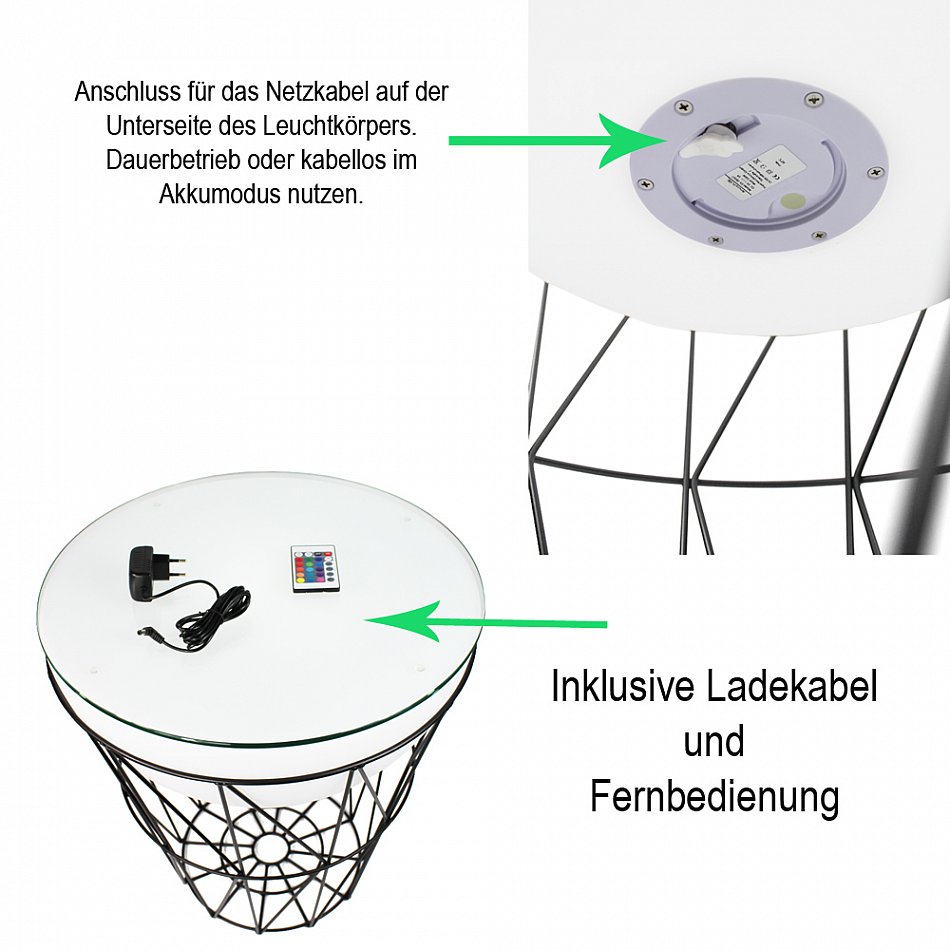 Auf der Unterseite des Leuchtkörpers befindet sich die Ladebuchse sowie ein Schaltknopf, damit auch ohne Fernbedienung die Leuchtfarbe eingestellt werden kann.