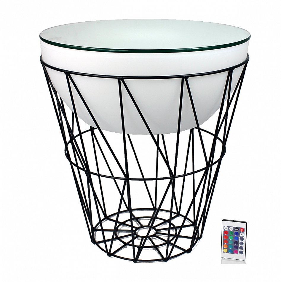 Die Kombination vom rustikalen Eisenkorb mit der modernen Leuchteinheit inklusive Glasplatte, lässt diesen Couchtisch zum optischen Highlight werden.