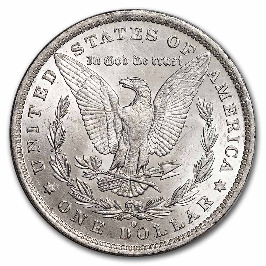 Morgan Dollar Reverse Design Like the obverse (front), the reverse (back) was designed by George T. Morgan after several patterns were made before finally settling on the final design. A strong and heraldic eagle is shown clutching an olive branch and arrows, which symbolizes that the United States is a peaceful nation, but one that will defend itself.