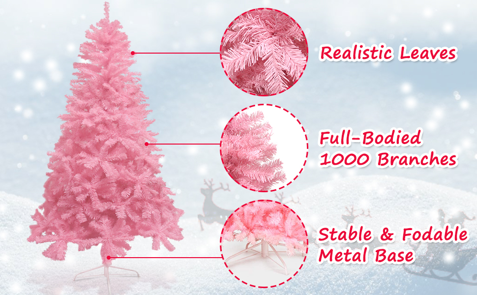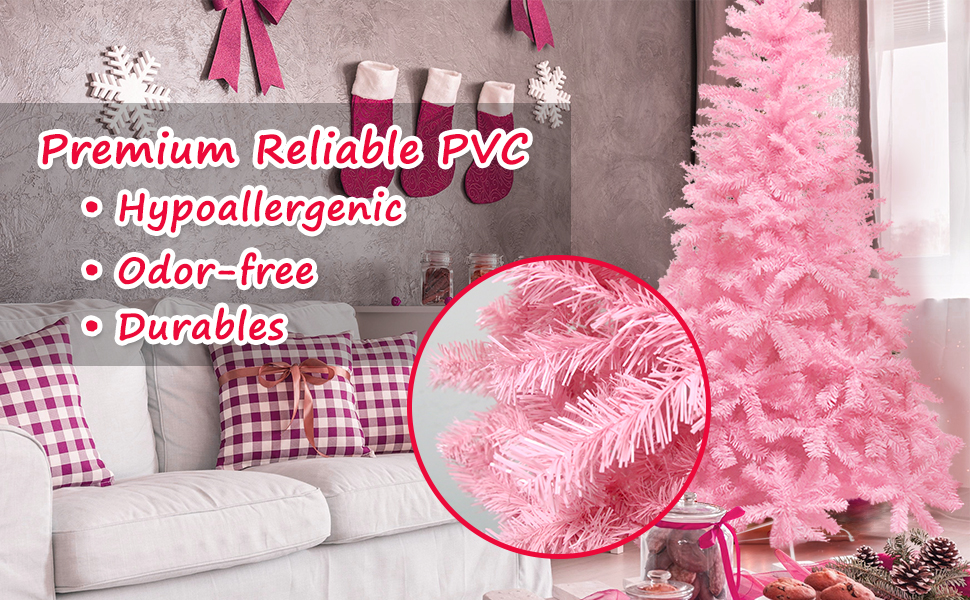 The non-toxic, high-quality PVC plastic is shredded into 0.1 inches thick needles resembling a natural ever pink tree. These 1000 fade-resistant branches with layered flat tips are easy to fluff to create a natural and fluffed 7.5ft Christmas tree.