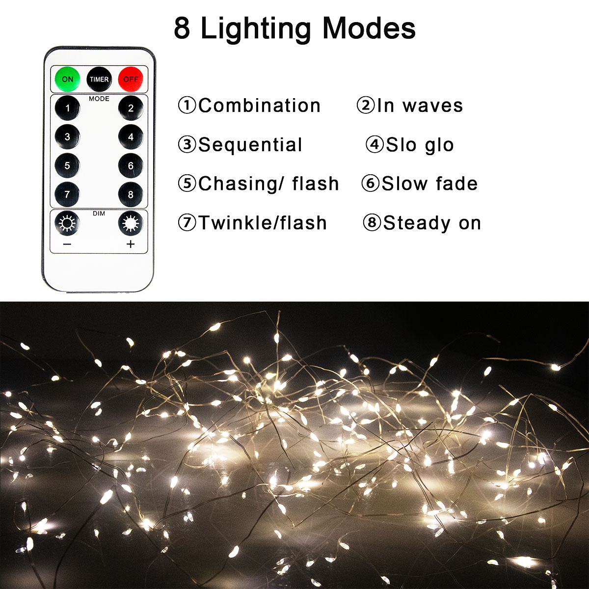 13 Key Remote & Timer: 8 modes of remote control & one mode of a timer set