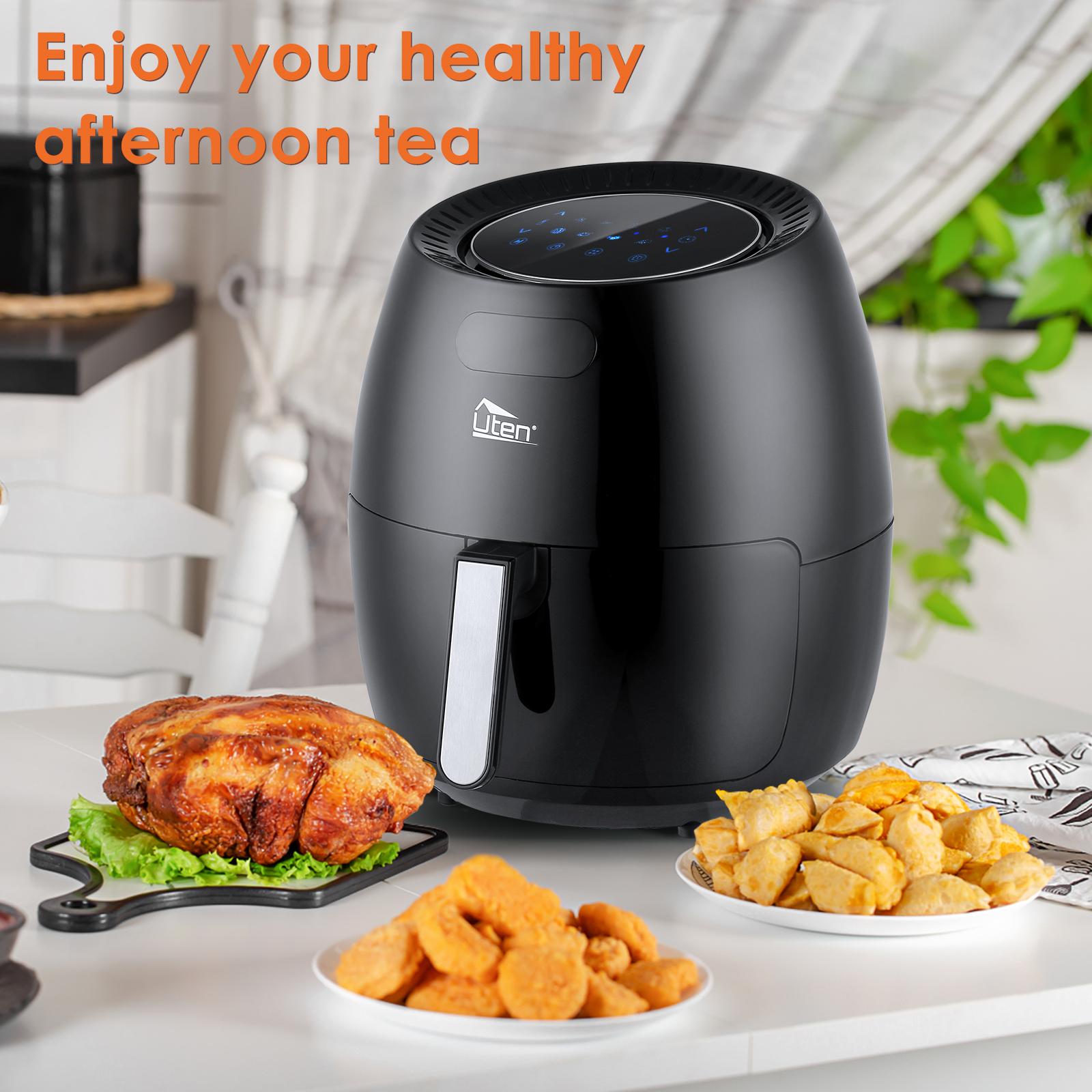 New air fryer, bigger capacity. Using air circulation technology to cook food, almost no oil is needed. Adjustable temperature control ensures that food is cooked correctly. You can cook between 100'C and 200'C to help you achieve the perfect result you want. Compared to traditional deep fat fryers, this air fryer can reduce fat in food by 80%. The enclosed cooking system provides a safe splash, cooking at up to 200 ° C, and the outer body remains cool. Things that can be cooked in the air fryer include: frozen potato chips, raw chips (a little oil), chicken wings, chicken nuggets, chicken legs, chicken, steak, pies and cakes (requires appropriate tin), samosas and spring rolls (with oil spray) , fish, vegetables and desserts.