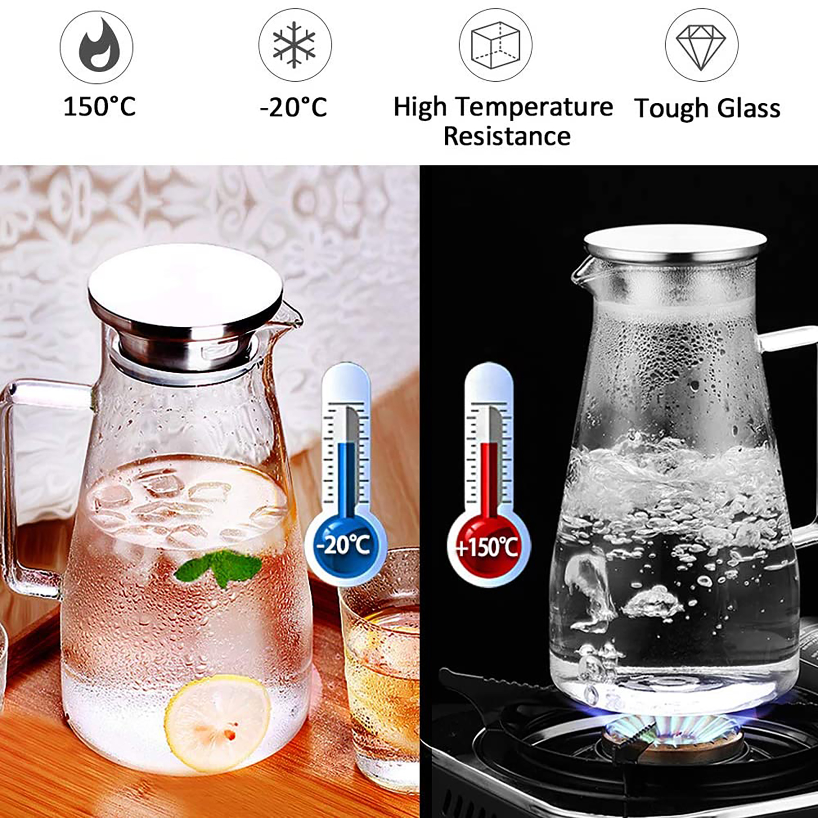 ✅ GOOD FOR COLD AND HOT WATER -The borosilicate glass can withstand the temperature from 20℃ to 150℃, enabling boiling or frozen water be poured directly into it (1.8Liter)
