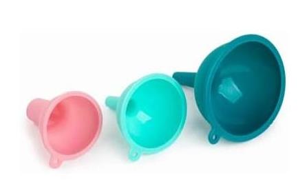 Colorful, flexible, and easy to clean, this Essential Silicone 3 Piece Funnel Set is an excellent addition to your kitchen tools. This heat resistant and colorful funnel set includes one small, one medium, and one large funnel for all of your needs. Product Dimensions: Lg - 4.25" dia x 4.25", Md - 3.25" x 3.25" & Sm - 2.75" x 2.75".