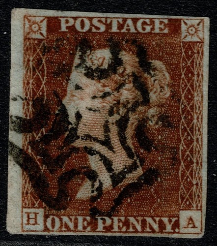 A very good used 1841 1d Red-Brown from Black plate 8 lettered HA, with four good to very large margins and cancelled by a black Maltese Cross. Part sheet marginal. Variety: 'double A'. Pinhole, but fine appearance. SG 7 Spec. AS51c Cat. £280.00