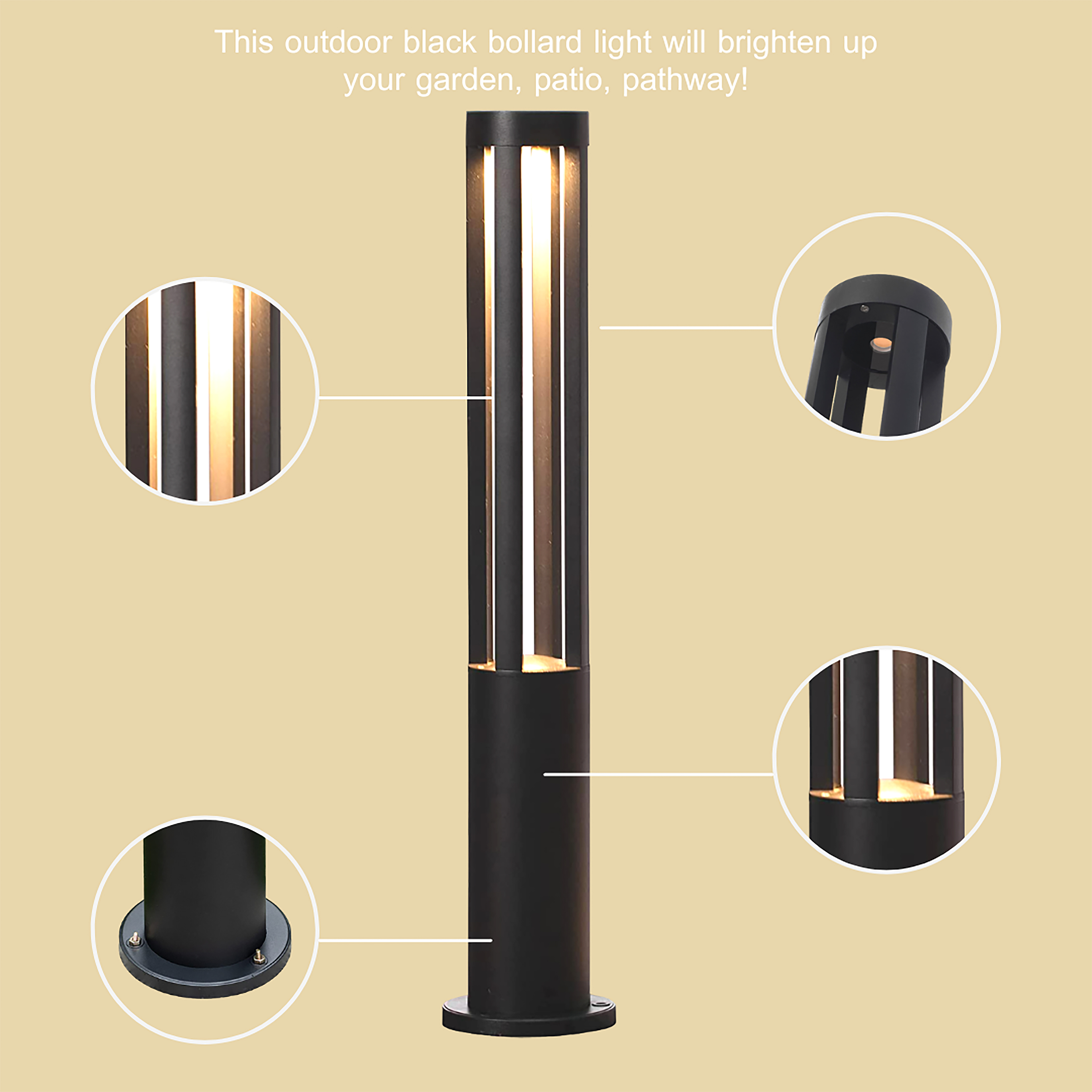 Add an elegant touch and a beautiful artistic design to your outdoor living with this modern bollard light. Composed of thickened die-cast aluminum structure material, Upgraded IP65 waterproof and rustproof. This outdoor black bollard light will brighten up your garden, patio, pathway, courtyard, or driveway.