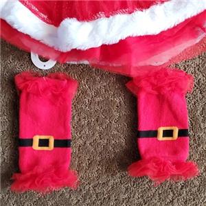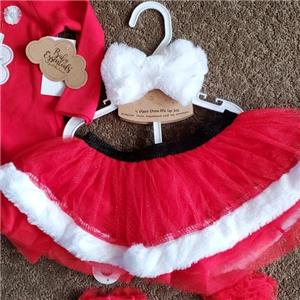 Includes: Long sleeve ribbed knit bodysuit with lap shoulders and snap closure Red tutu skirt with Faux Fur Trim, Ruffled leg warmers, and Faux Fur Bow headband