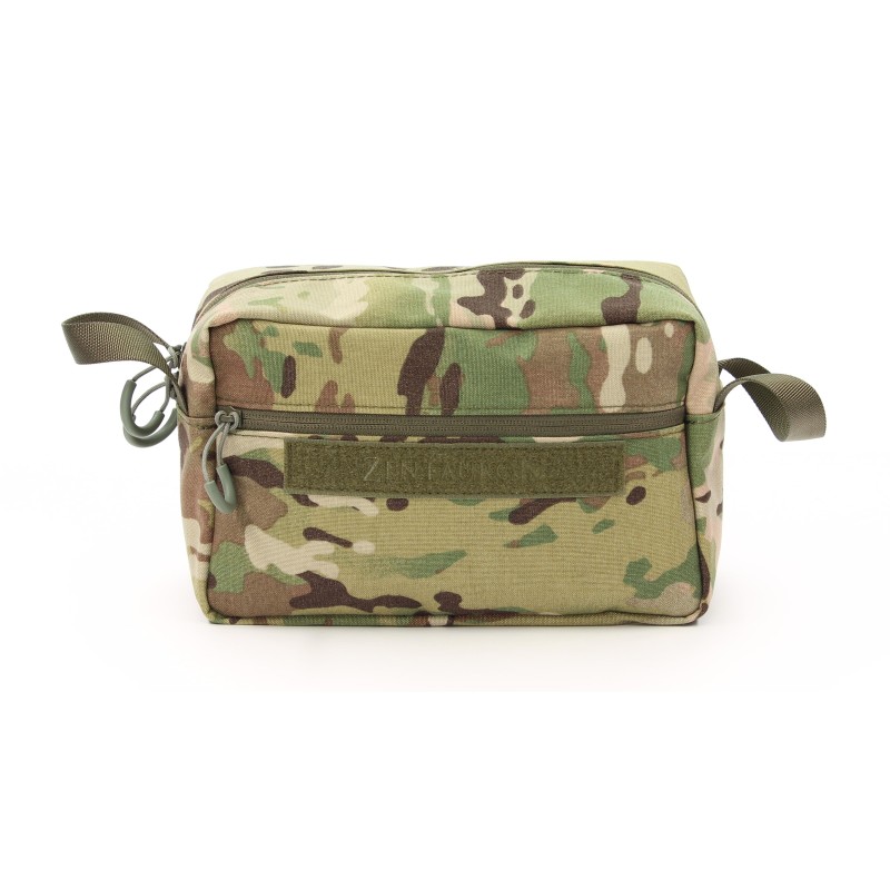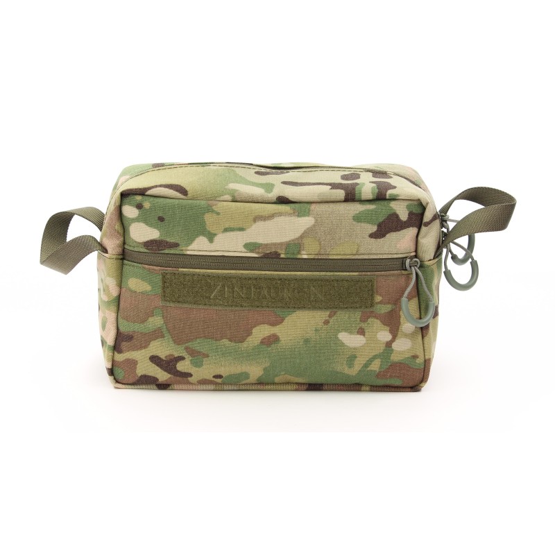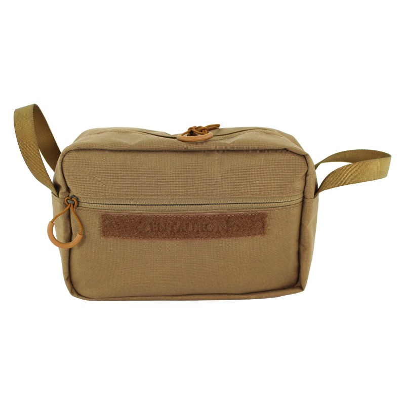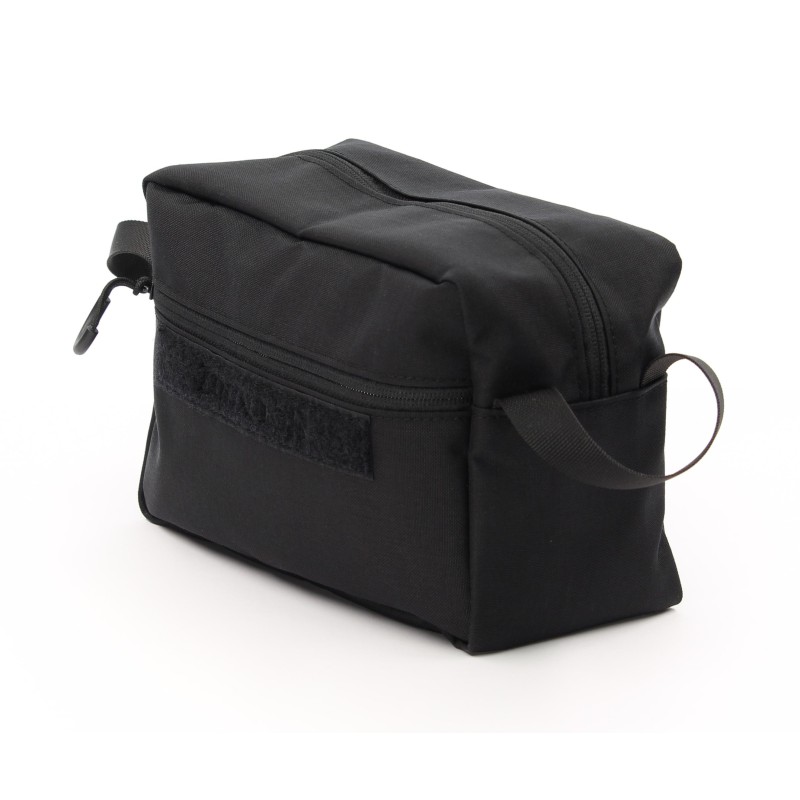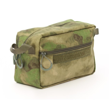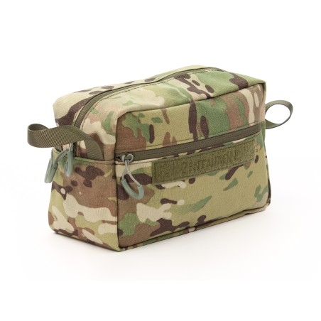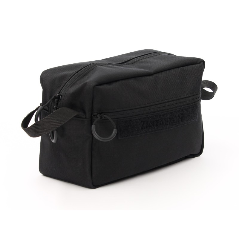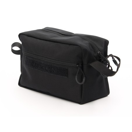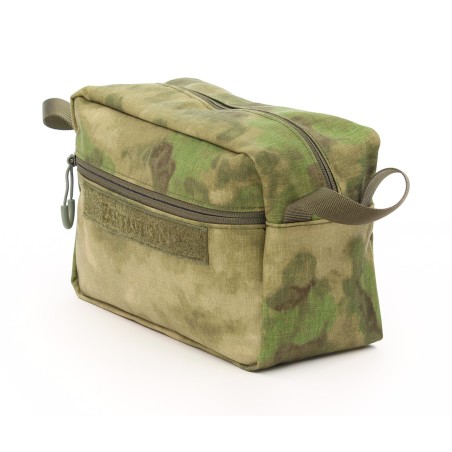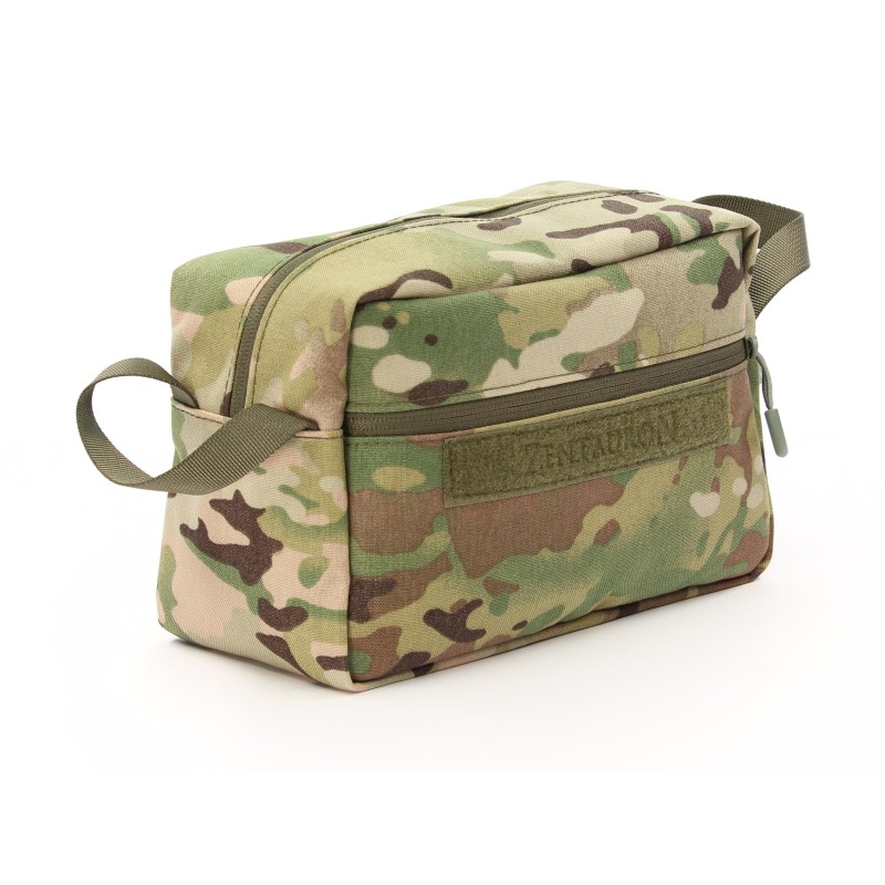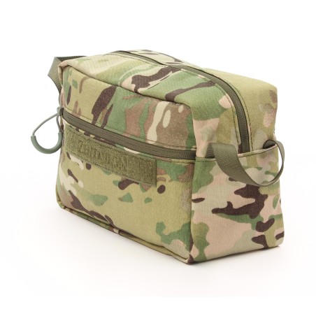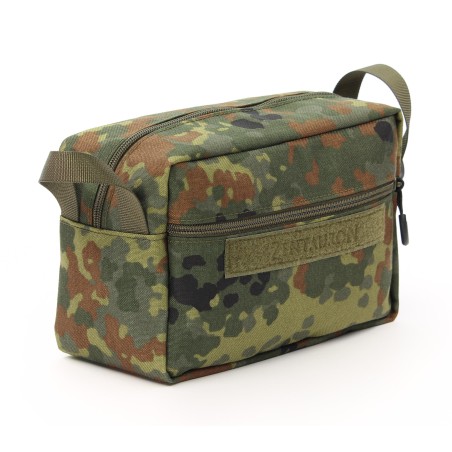 Das große Hauptfach lässt sich mittels Reißverschluss öffnen und besitzt Innen zwei Einschubfächer. Dadurch ist ausreichend Platz für Hygiene- und Pflegeartikel, Medikamente, kleine Werkzeuge etc. Außen befinden sich an der Vorder- und Rückseite je ein Reißverschlussfach, worin etwas kleinere Dinge wie Schlüssel oder Karten untergebracht werden können. Die beiden aufgenähten Klettstreifen sind nicht nur praktisch, sondern werten durch das eingearbeitete Zentauron auf der Vorderseite, die Toilettentasche optisch auf.