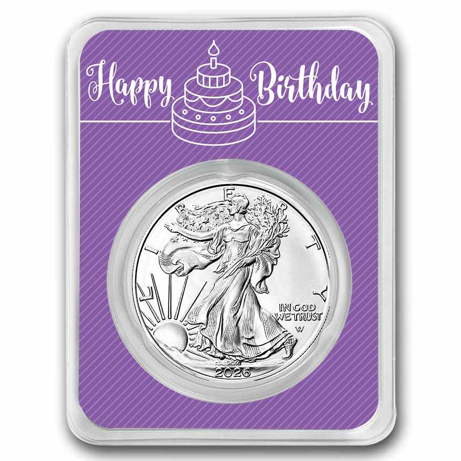 These Silver Eagles presented in birthday-themed cards are ideal for giving to friends, family members and loved ones, and make a timeless gift that is sure to last a lifetime. Add this 1 oz Silver Eagle to your cart today!