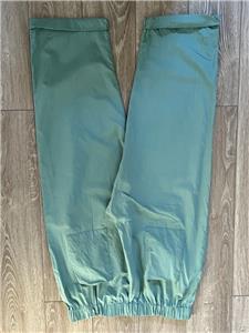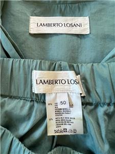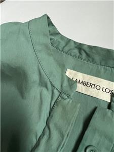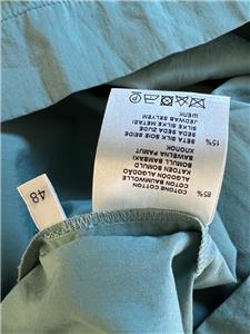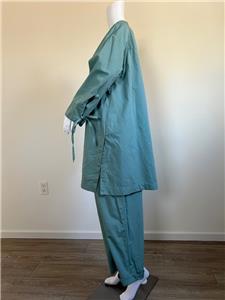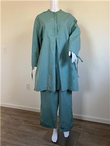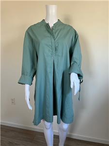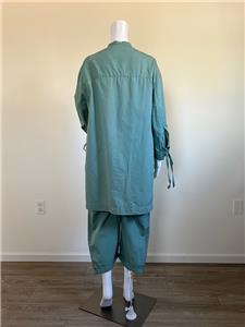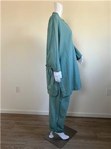 Gorgeous cotton and silk blend poplin fabric is simply wonderful for this tunic and crop pant duo - interesting sage blue green hue is quite beautiful in nice relaxed style - button down Henley with inverted box pleat finish in gentle A-line cut - side seam vents and wrist length sleeves finished with tie accent - easy pull-on crop pant with cuffs and rear patch pockets. FYI our mannequin wears size US 4 or 6...