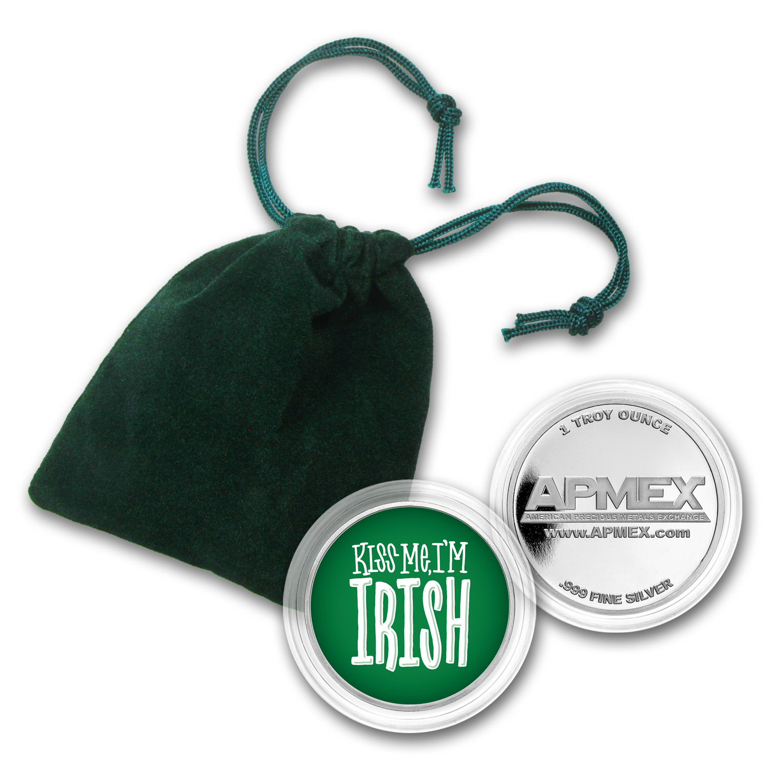 - Obverse: Reads, Kiss Me I'm Irish in a fun, white font on an emerald green background.