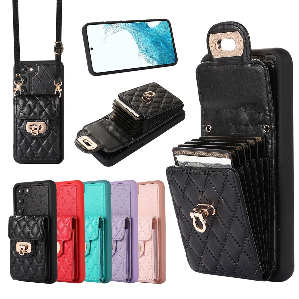 | Luxury Grid Leather Credit Card Slots Wallet Back Shockproof Case Cover Shoulder Lanyard For Samsung Galaxy Phone |