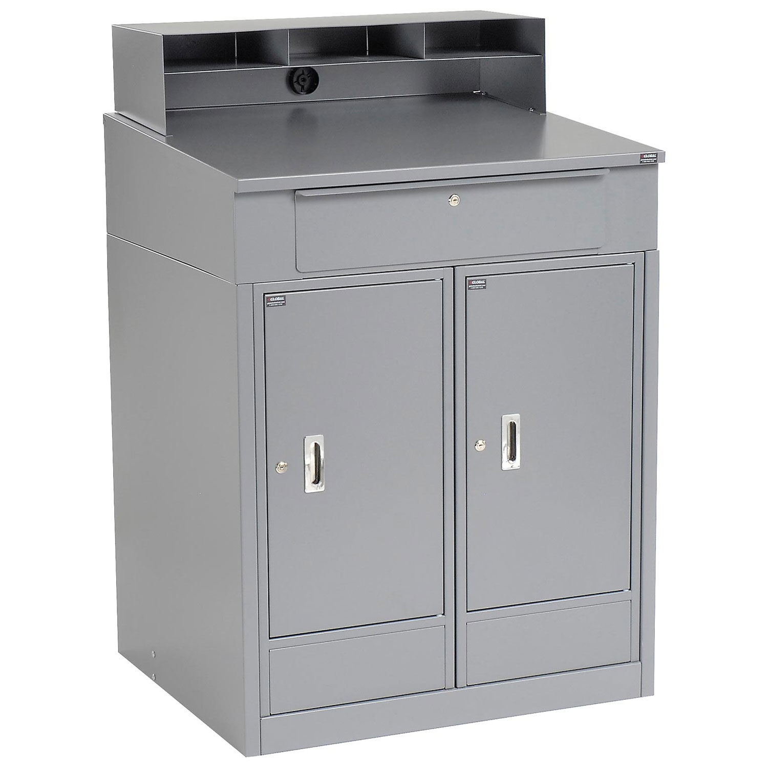 Wall mount desk conveniently folds away when not in use to provide optimal work space. Wall mount shop desk provides a work surface where you need it. Ideal for loading docks, warehouses, factory floors, supply rooms and shipping & receiving areas. Folding shop desk mounts to wall at desired work height to accommodate stand-up or sit-down work positions. Made of durable steel with a scratch resistant powder coat finish. Full width handle lowers desk to provide a convenient 13D work surface. Interior features a convenient pen storage compartment for pens, small tools and other supplies. Also includes a storage bin for charts, folders and other literature. Magnetic closure keeps door in place. Locking desk includes a cylinder lock with 2 keys for security. Helps prevent unwanted desk opening. Measures 20W x 3-3/8D x 16-3/8H. Hardware included., Lot of 1