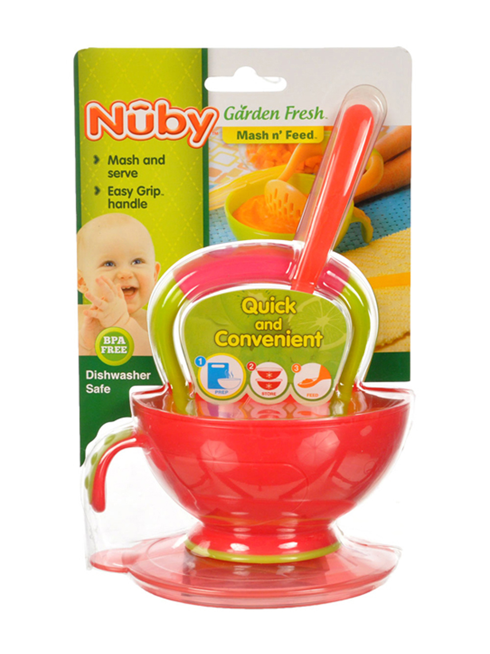 Conveniently prepare and serve nutritious food for baby with the Nuby Mash n' Feed set - Garden Fresh edition! Set comes with bowl, masher, spoon, and travel top. Dishwasher Safe BPA Free Imported