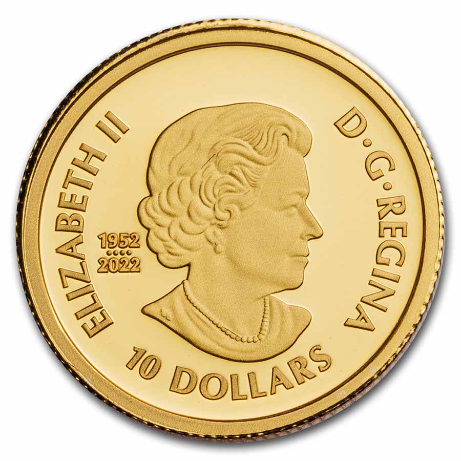 - Obverse: The obverse also bears a special marking that includes four pearls symbolizing the four effigies that have graced Canadian coins and the double date of her reign.