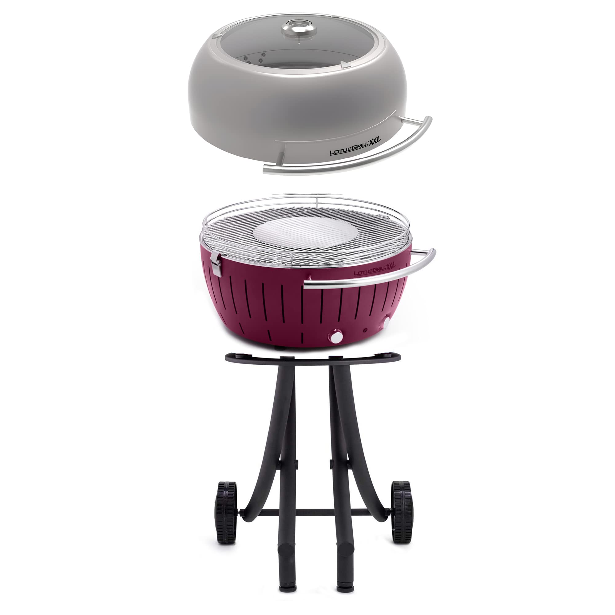 The LotusGrill smokeless grill is the safest and fastest of its kind. The outdoor barbecue can be powered by batteries and connected directly to the power source via a splash-proof cable. The garden grill only needs a maximum of 1 kilogram of charcoal, and it heats up in five minutes. The grill stands on a two-wheeled trolley with a height-adjustable base for ideal alignment on uneven surfaces. THIS BUNDLE INCLUDES: (1) LotusGrill-XXL (1) Grill Stand (1) Grill Glass Lid - XXL
