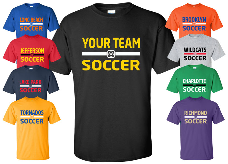 ![]() ![]() Custom Soccer Team T-Shirt This listing is for a new Custom Soccer Team t-shirt, available in your choice of over 30 shirt colors and 15 print colors. We use high quality 100% cotton shirts from Gildan. If you prefer a different style or brand just let us know. This listing is for adult sizes small through 4XL. See size chart below for measurements. This design features your custom text on front. You also have the option to add a name and/or number on back. Please be sure to add a note in the "Message to seller" box on the checkout page with details for your order. Here's How It Works When placing your order please use the "Message to seller" box on the checkout page to provide the details for your item(s). Please include the shirt color and print colors you would like as well as the team name or text for the top line. For the print colors please indicate which color you would like for the text and which color for the horizontal stripe. If you select the options to add a name and/or number on back please provide that information as well. If you have any questions let us know.