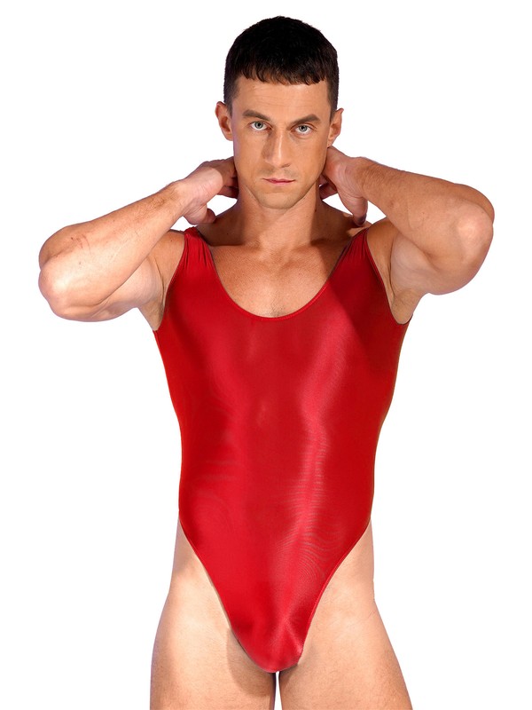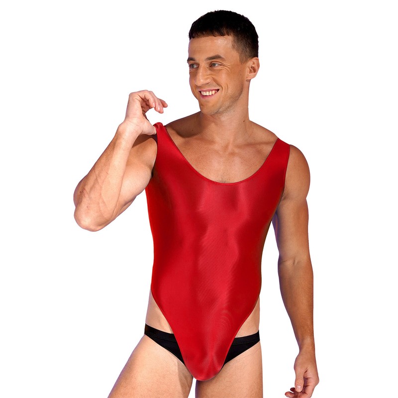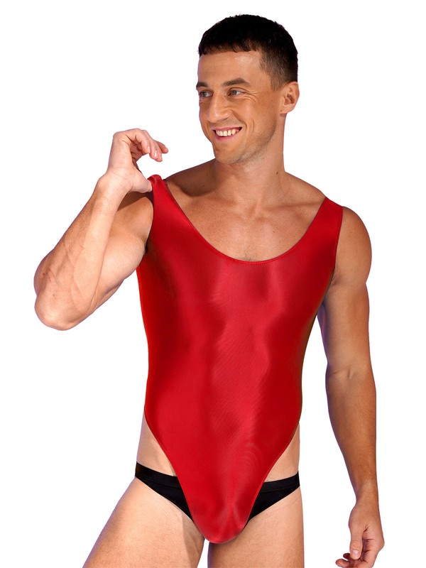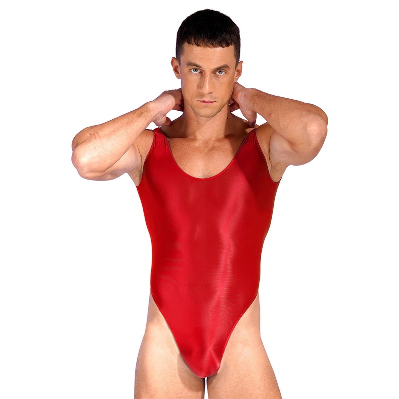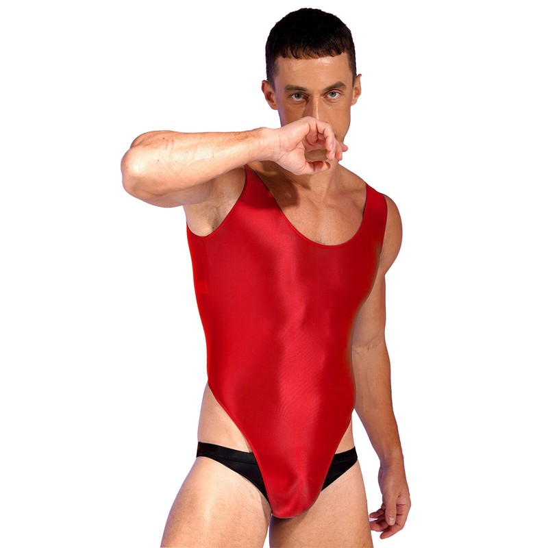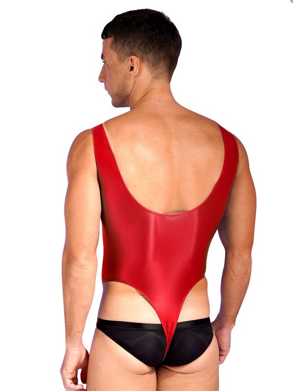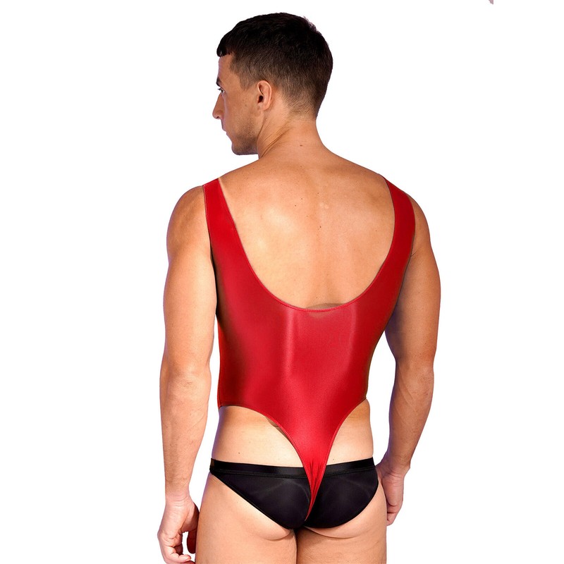 Glossy stretchy bodysuit for men, solid color, round neck, backless, sleeveless, simple but stylish.