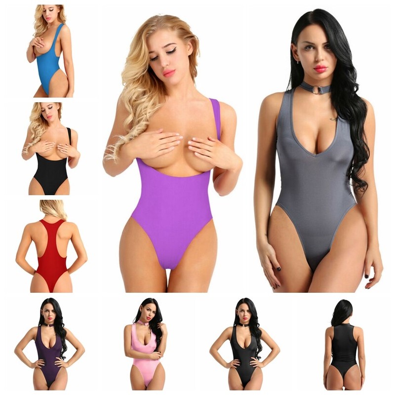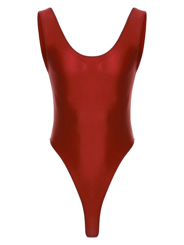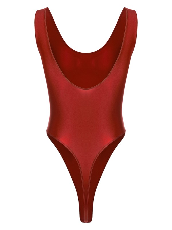 Glossy bodysuit, solid color, round neck, sleeveless, high cut design, backless.