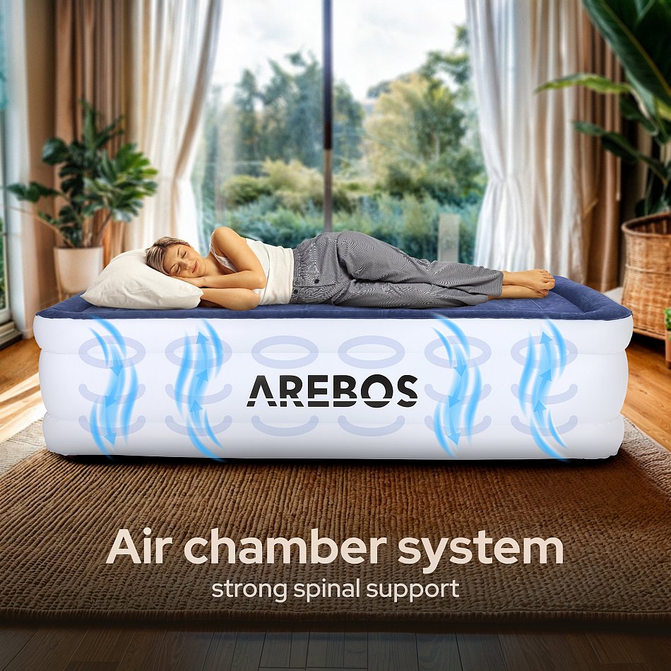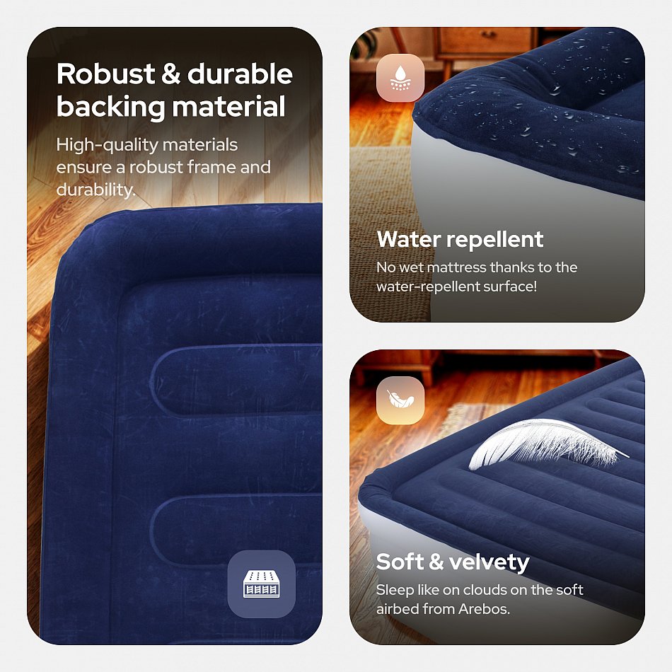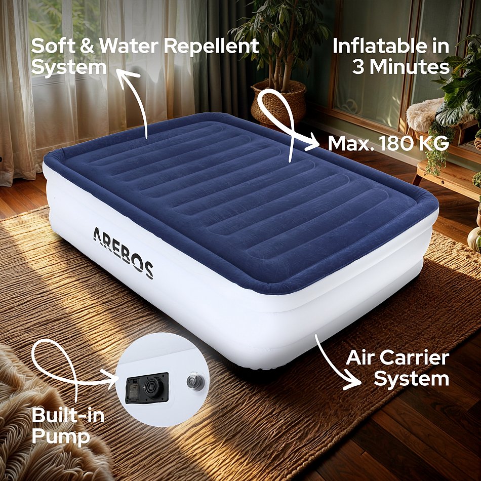 Las camas de aire de AREBOS son más grandes y estables que los colchones de aire normales. Las camas de aire de AREBOS están especialmente diseñadas para un sueño cómodo y reparador gracias al nuevo tipo de PVC.