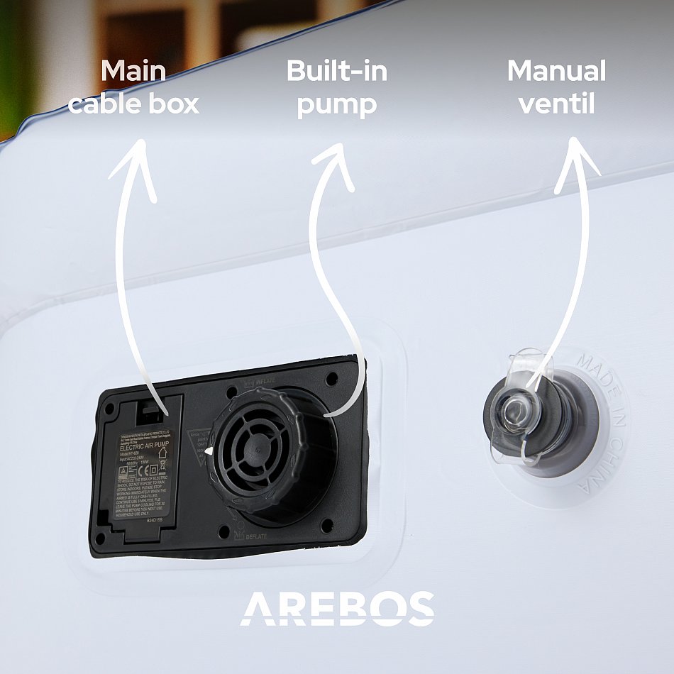 La cama de aire AREBOS tiene una bomba eléctrica incorporada, por lo que todo lo que tiene que hacer es enchufarla y encender la bomba: la cama de aire se infla sola en sólo unos minutos. Así podrá crear en pocos minutos un agradable espacio para dormir en el camping, en su domicilio de invitados o para los huéspedes que pernocten. Además, lleva integrada una válvula de aire manual para inflar y desinflar en caso de que la bomba eléctrica funcione mal o no tenga a mano una toma de corriente.
